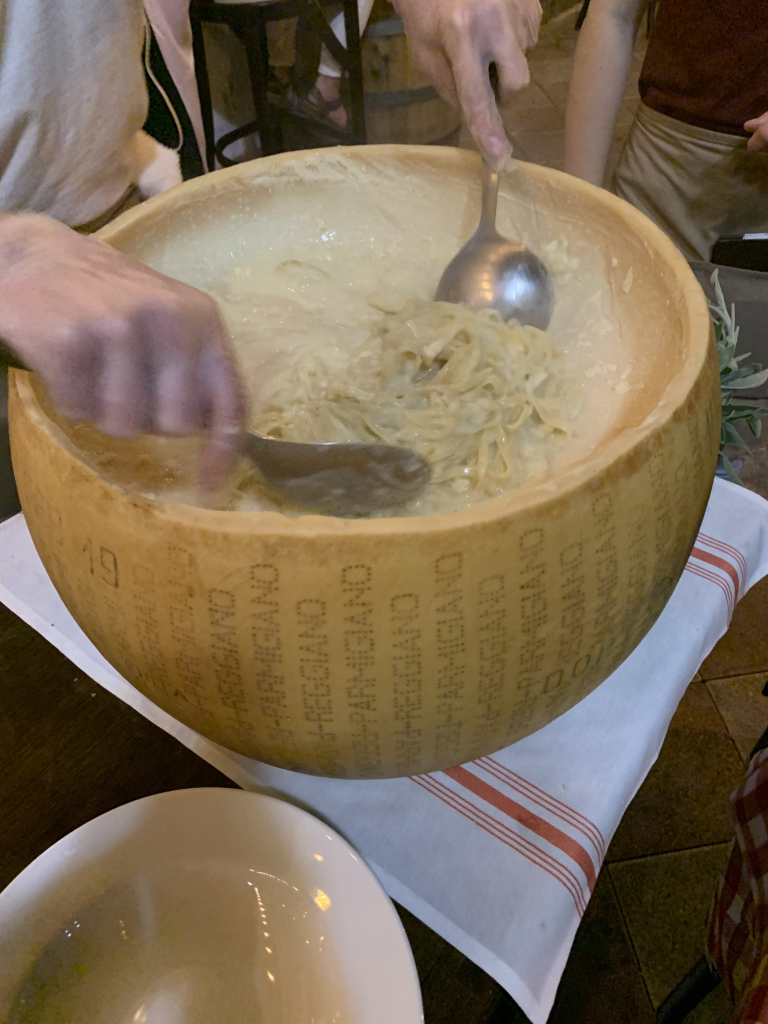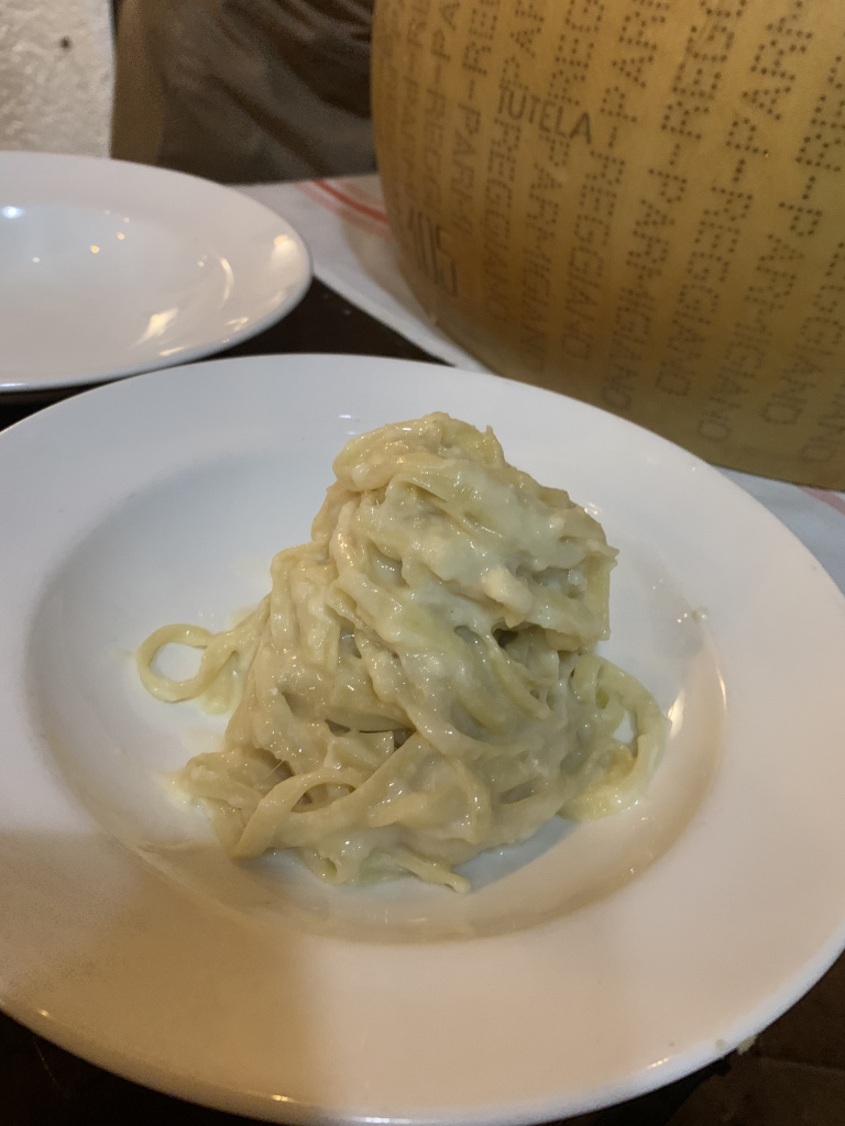 Here’s a version I recently had at La Trattoria in Naples on 5th Ave. Very rich and tasty, but made with Parmigiana and fettuccine. Prepared inside the wheel of cheese. Also, not quite enough pepper. Good, but not the real thing.