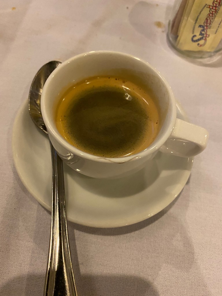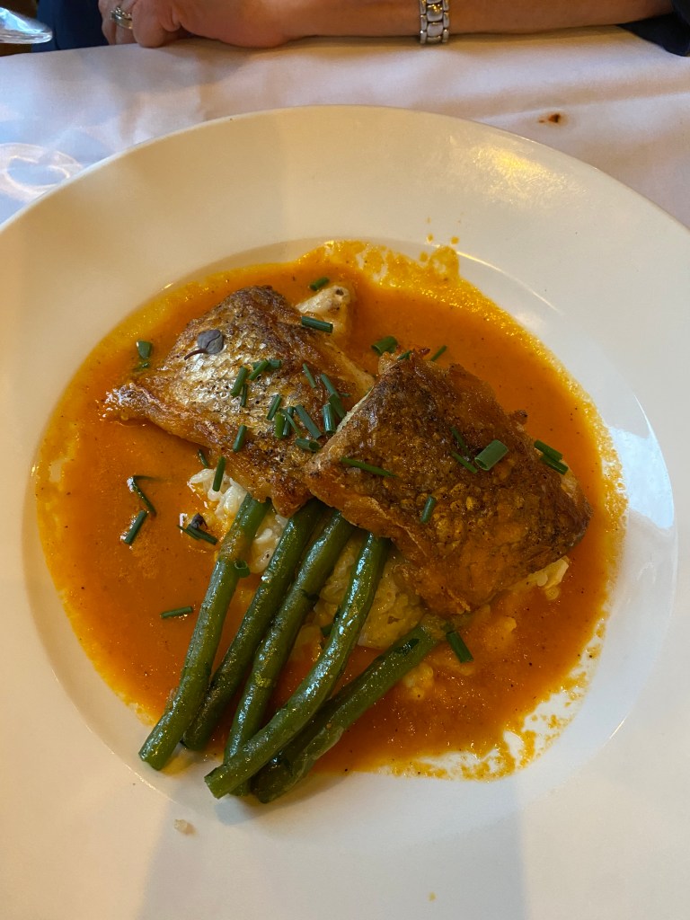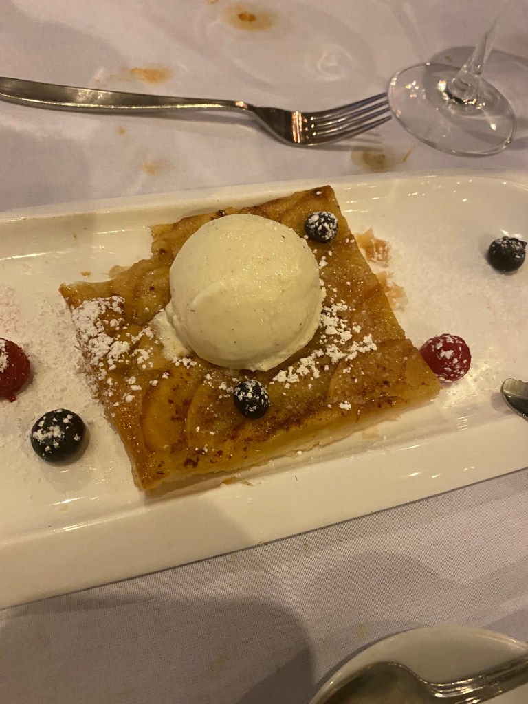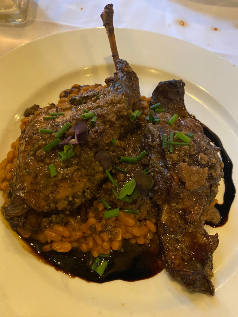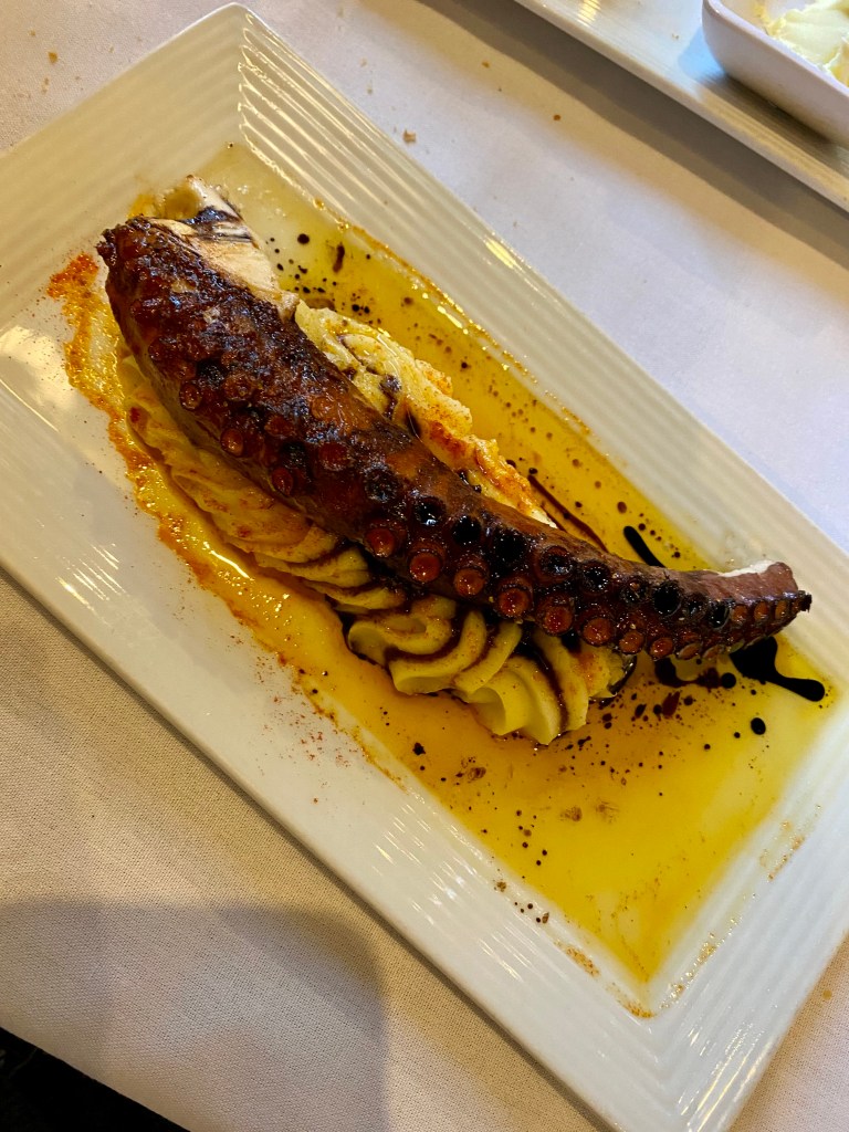 We started our meal with a very tender piece of Grilled Octopus which is traditionally served with potatoes. This chef served it over some of the creamiest mashed potatoes I’ve ever had. The presentation was quite attractive.As often occurs when we dine out, we start eating a dish before I have photographed it.The Artichokes with Serrano Ham were served with a slightly spicy sauce made with some kind of peppers and, I believe, tomatoes. We had a slight misunderstanding with our waiter who brought us out a different appetizer of crusty bread coated with garlic and covered with Serrano ham. When we told him we didn’t order that dish he apologized and told us to keep iton the house, a very gracious and hospitable gesture on his part.One of my favorite foods is Rabbit, when it’s well prepared. This Braised Rabbit with Lentils and Rabbit Jus was delicious, moist and tender. The Lentils andSauce were perfect complements.Barb really enjoyed her Tile Fish which was served with Crabmeat Risotto. I ate the risotto and she asked for aside of vegetables. They were pleased to accommodate her request.Something I truly enjoy, but seldom find is a Decaf Espresso. They had it and I enjoyed it.Once again, we didn’t wait for a photo before starting our Apple Tarte dessert. This Apple dessert was a perfect finish to a wonderful meal.
