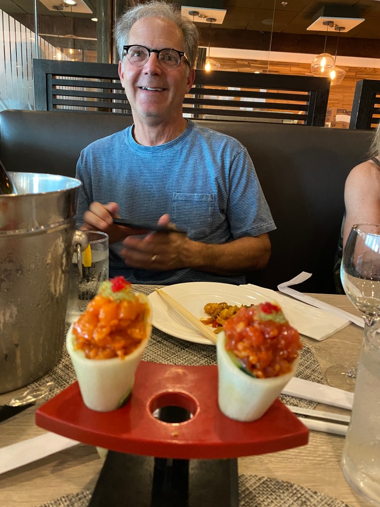 Gary is checking out the Crunchy Cucumber hand rolls. One had Salmon and the other had Tuna.