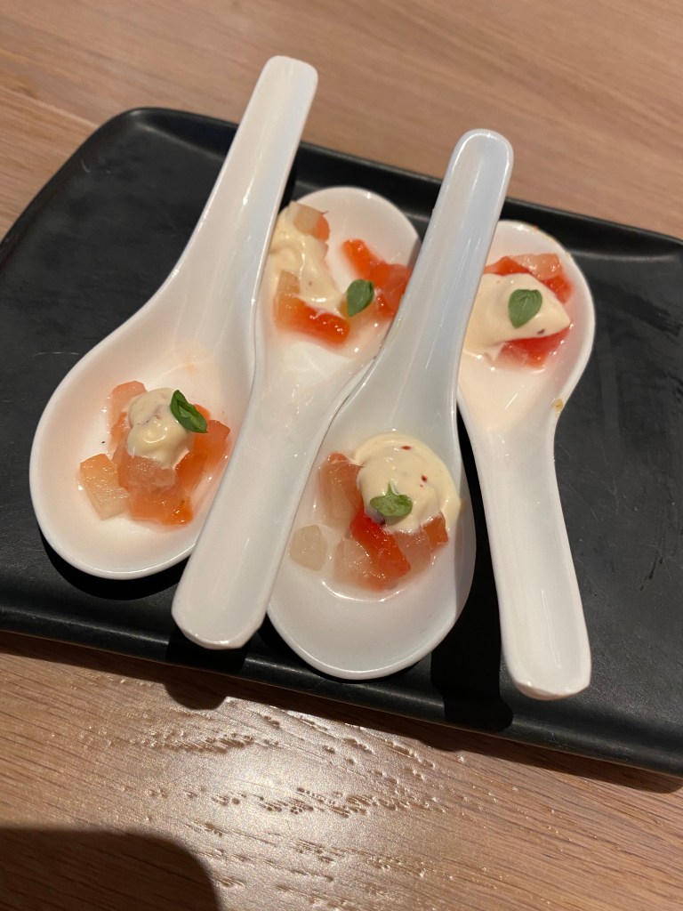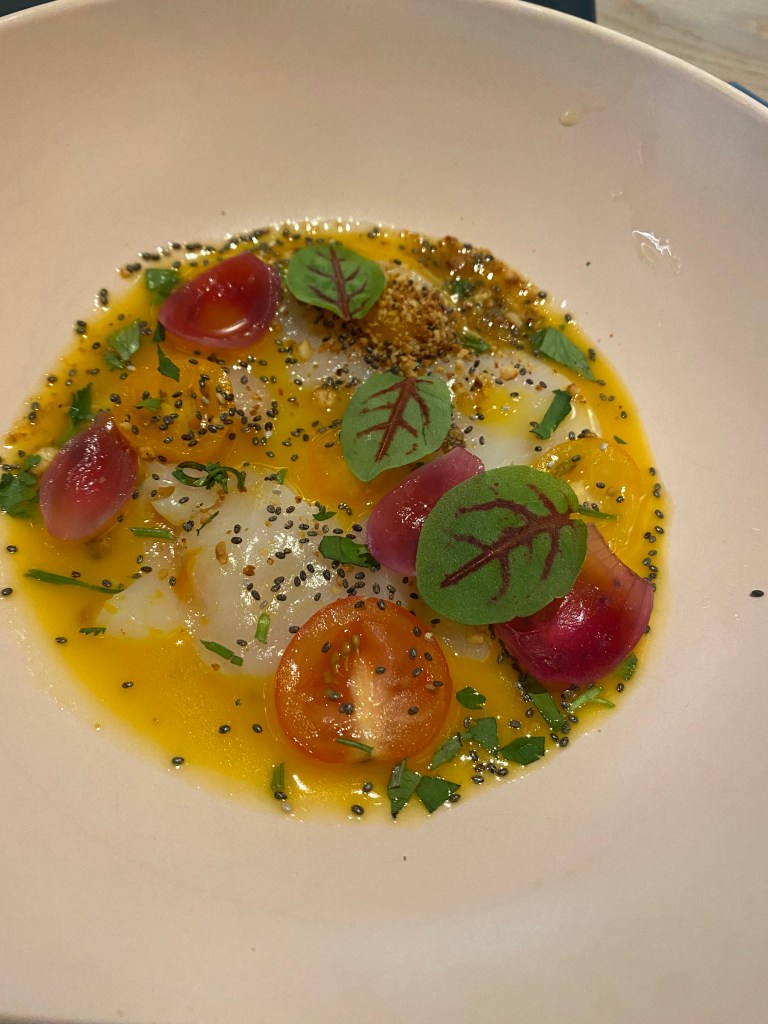 I started withthis very interesting Mushroomed- infused OldFashioned using Rye.John had a Manhattan made with Bullit Rye.Barb had a Vodka Cocktail 2.1 with Lime juice. Similar to her regular cocktail.Cindy had a glass of Sea Sun Chardonnay.They started us out with an Amuse Bouche: pickled watermelon with a creme fraiche and mini-basil.I ordered a roasted eggplant appetizer with whipped ricotta. Quite delicious. Ate half of it before I remembered to take this picture.The Scallop Crudo was perfectly marinated in citrusjuice and beautifully garnished. Remember that we also eat with our eyes.Cindy had Trout Amandine which was gorgeous and she said very fresh and delicious.Barb ordered the Zuchini Pasta which she reallyenjoyed.John and I both ordered the Riccoto Gnocci with Mushrooms and Corn Salsa. This was exquisite, tasty and generously portioned The bar at Solstice is modern, pretty and welcoming The owner, Rick, and his staff are all very pleasant, engaging and informative.The 5 Coriander Spiced Ricotta Doughnuts we had for dessert were delicious and enhanced by the the Chocolate and Caramel dipping sauces.