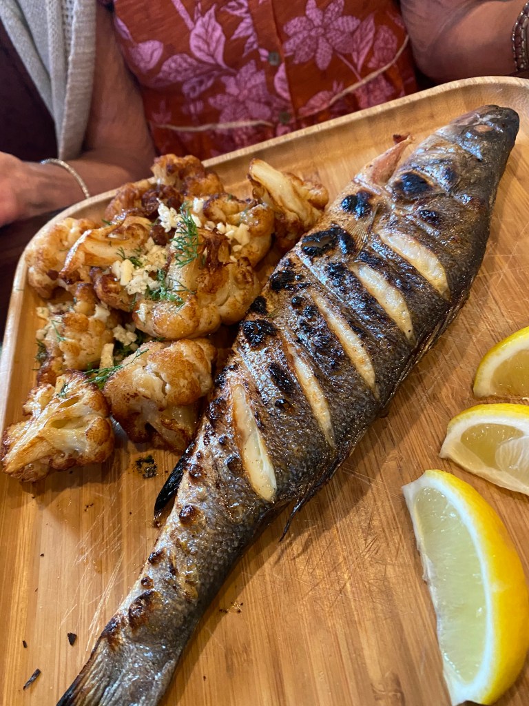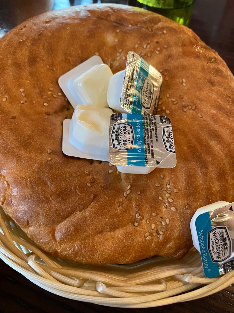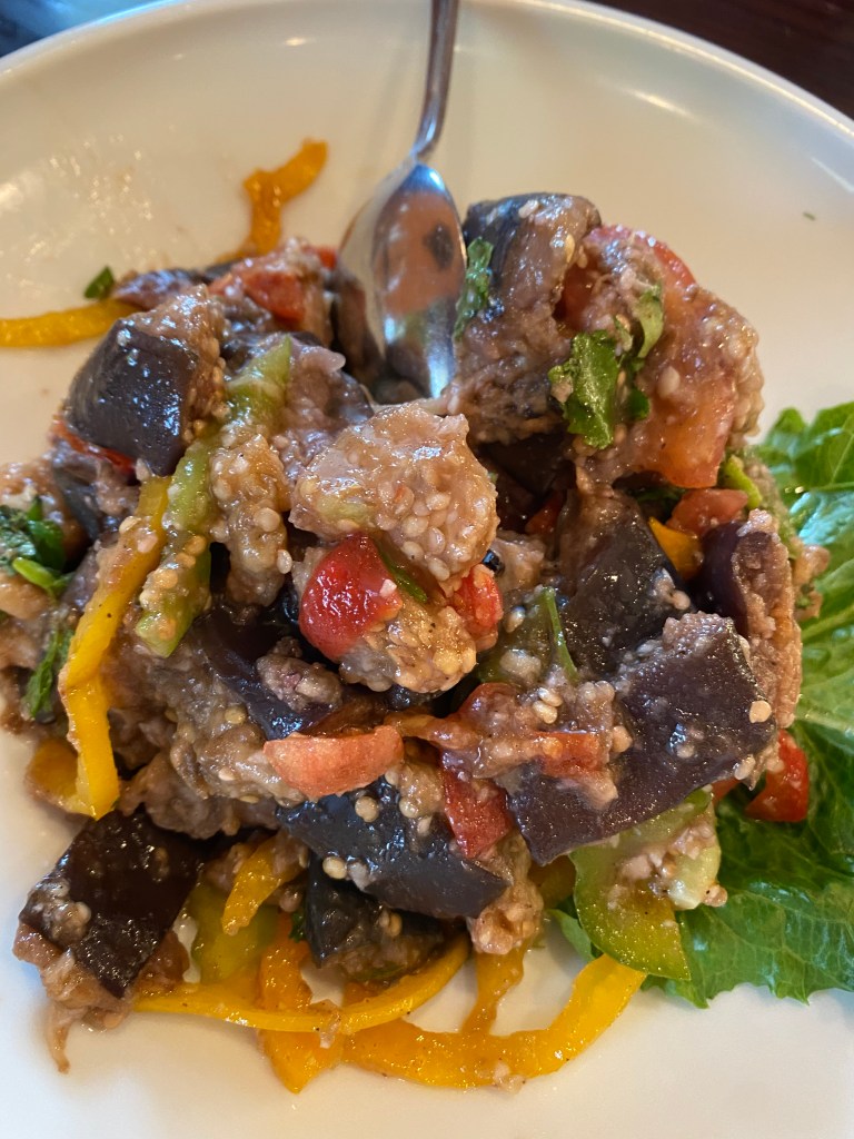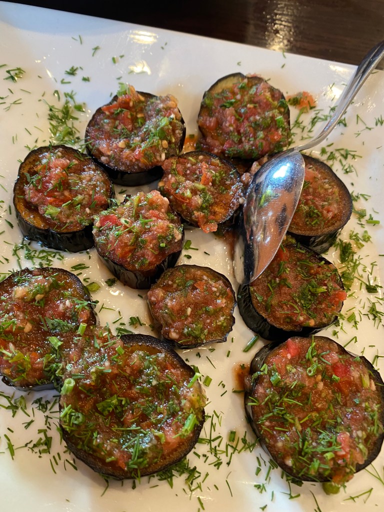 You have to pay for the bread here, but the value is outstanding. This Lepeshka came out steaming hot and had great texture and taste. $3.50.I have found many outstanding eggplant dishes in all of the Russian supermarkets and restaurants. This Registran is roasted slices topped with fresh minced tomato-garlic sauce. Amazing taste, but I had to remove the tough skin. Barb called me a wimp and enjoyed eating the skin.We also enjoyed this Vostochny which had roasted eggplant, plum tomatoes, and green and yellow bell peppers, garnished with fresh dill, cilantro and minced garlic. Both eggplant dishes were listed as salads.$12 each. Nice portions.Manti is a dish I get at all the different Russian restaurants. I have come to crave this big dumpling. They stuff it with lamb and beef or pumpkin. (Can you guess which one I always order?) They serve it with a scoop of rich sour cream and caramelized onions. This Ribeye Roulette is rolled Ribeye (I think deckel) layered with lamb fat (also deckel) and roasted. It was served with marinated onions and dill. Prepared medium rare. It was tender and delish! Served with a side of home style potatoes.$13.Barb’s whole grilled Bronzino was perfectly prepared and very delicious and accompanied by grilled cauliflower . It was a daily special.Never miss the desserts at any Russian restaurant. The pastries are all delicate, rich and fabulous. Their crepes are as good as French. This Medovik was absolutely to die for. $7.