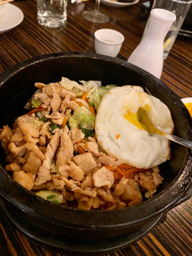 Barb got her usual, the Chicken Gopdol Bibimbop. She gets hers with brown rice which hardens at the bottom of the stone pot for a crazy good crisp finish.