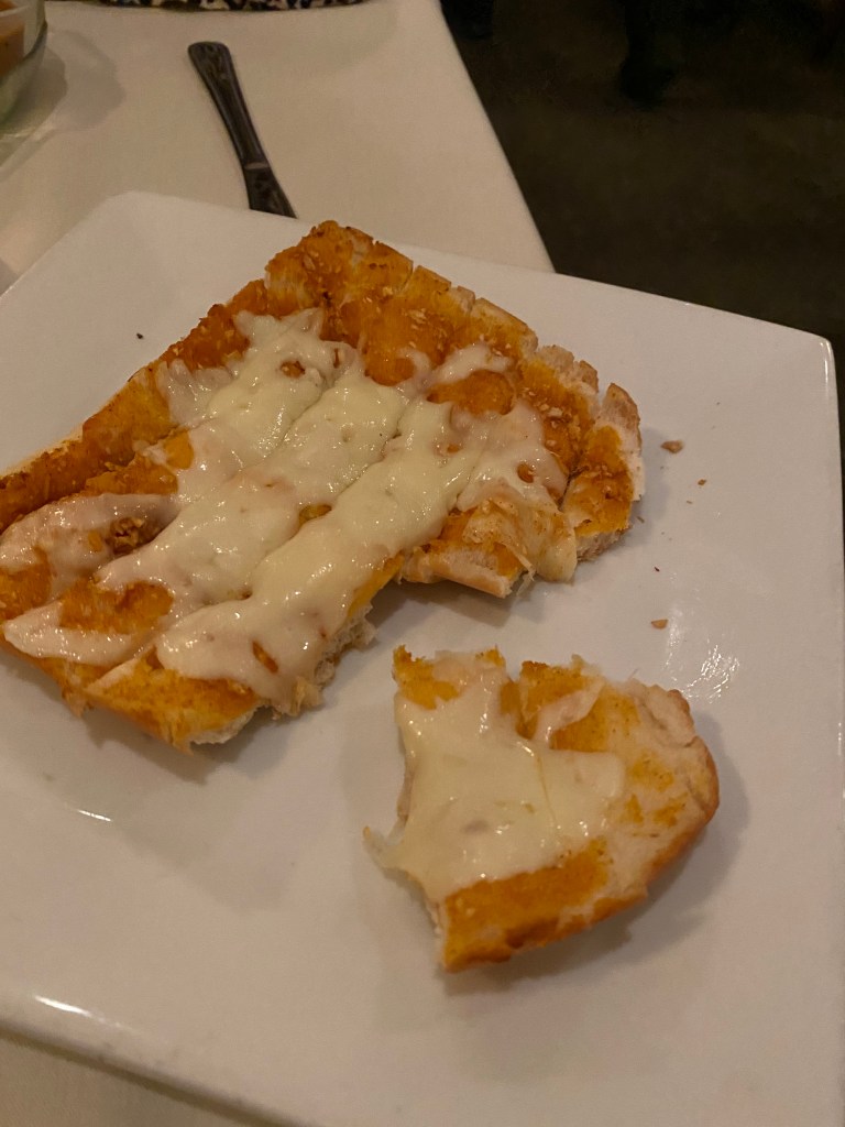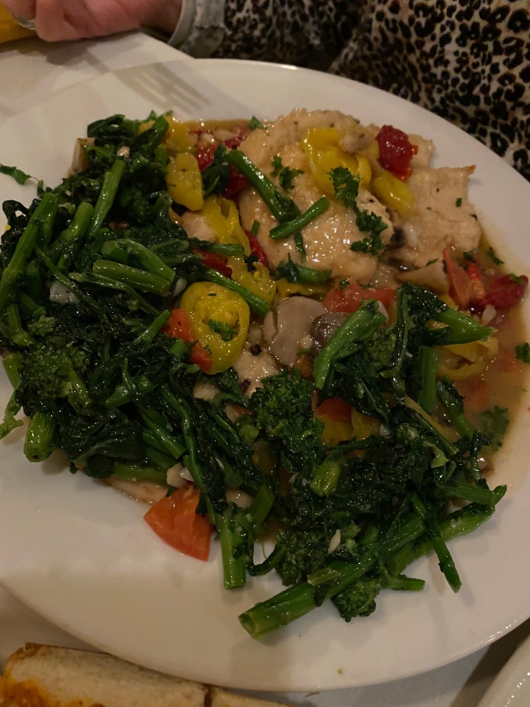 Sometimes I’m embarrassed to show up with a Costco wine. I shouldnt be because they are always excellent choices, great buys, and really good wines. This Rioja Riserva was absolutely delicious and cost me about $14. Every bit as good as a $28 bottle with a more impressive label. Entrees come with a small house salad. Barb gets the house vinaigrette and I get the Blue Cheese dressing.The garlic bread was nothing special, but not bad.This Chicken Parm was enormous, deeeeelocious, tender, and not over breaded.I love spaghetti with garlic and oil. Theirs is made with freshly sauteed garlic. They substitute their red sauce for this white, a huge plus for me. I almost always take some home. The entree is that big a portion.Barb has been getting the Chicken Paisanno. She switches out the pasta for Brocholli Rabe. I think its a $3 surcharge. She loves this dish.