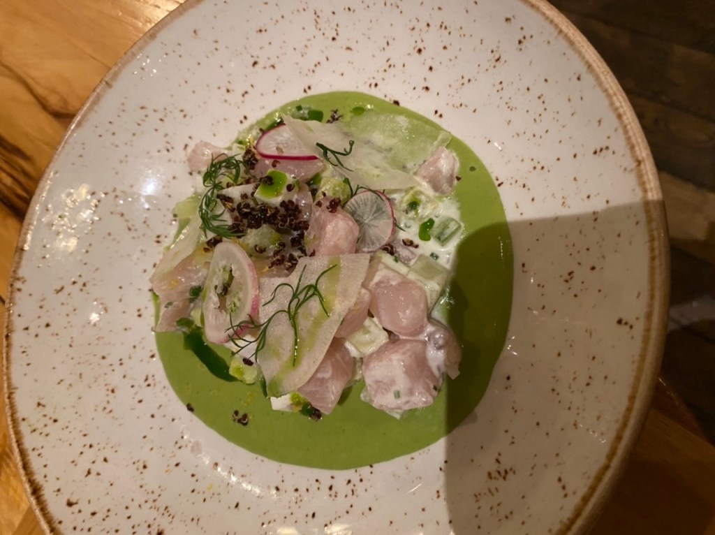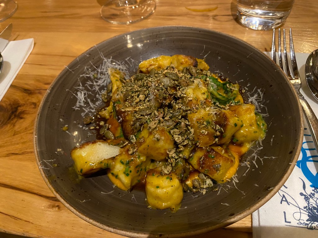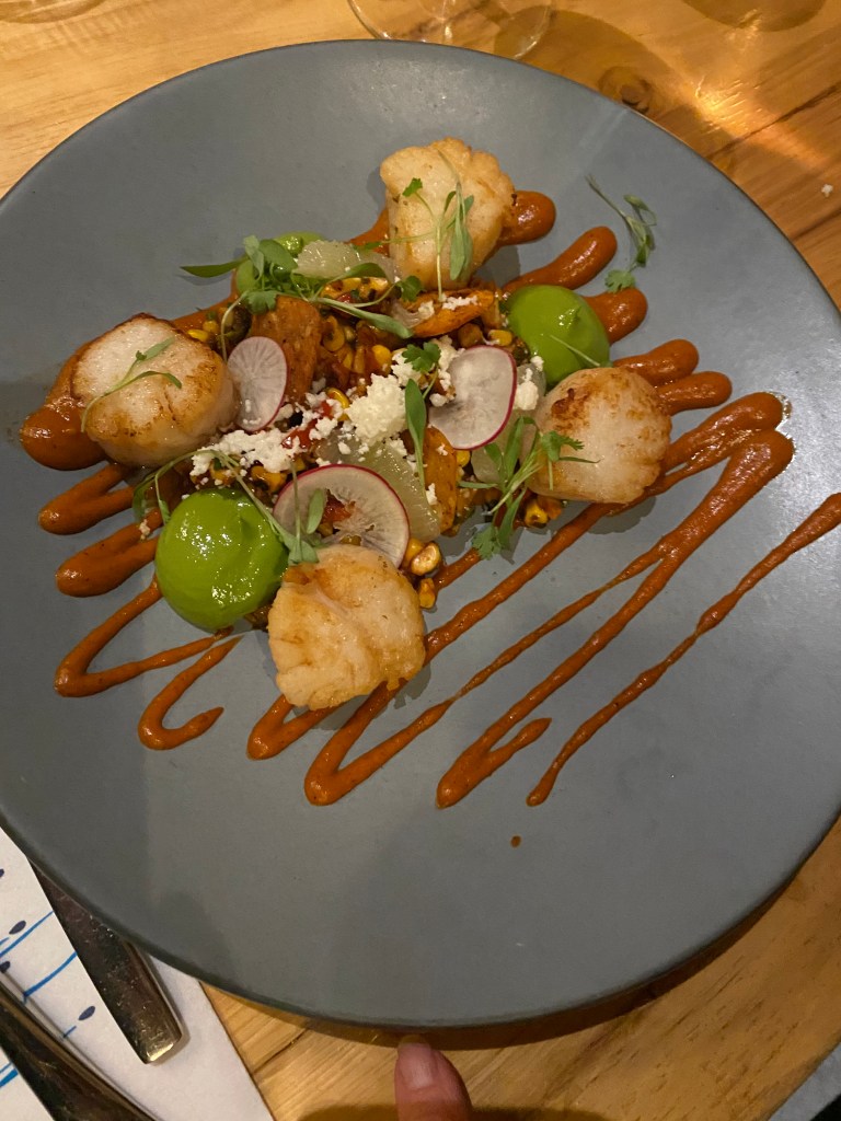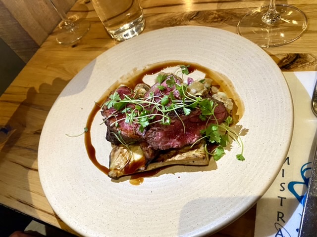 First, Mistral has a full bar with several of their own ”special house cocktails.” Zola and I both had Angel’s Envy Manhattans. Nicely made and served in a retro style glass (the new vogue). Sue had a spicy Margarita which pleased her and Barb had a flute of Prosecco.