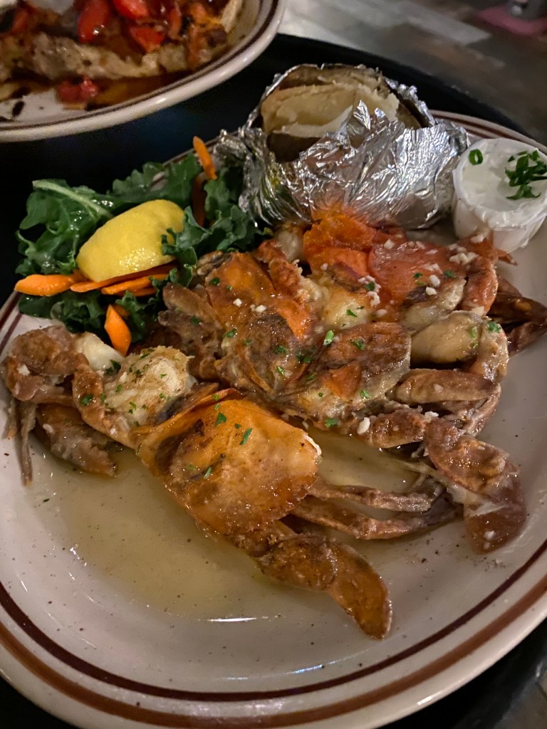 I’m a sucker for Soft Shell Crabs. They offer them fried or sautéed . I ordered them sauteed with the garlic butter. I always order them light on the garlic.