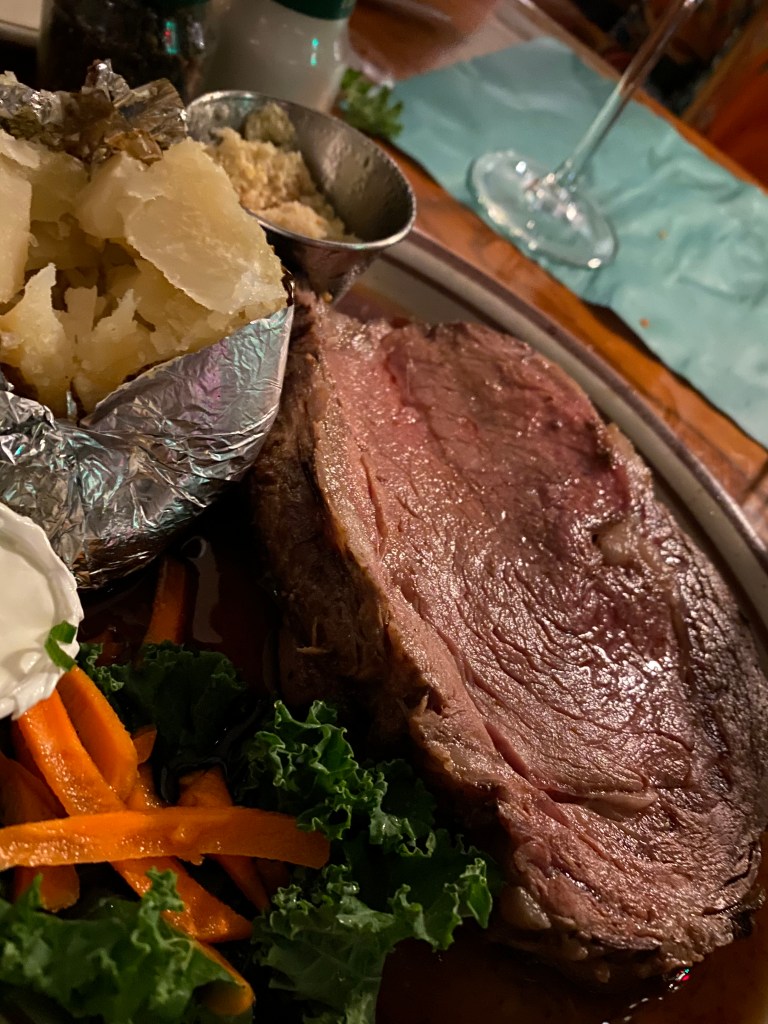 Nancy had the Prime Rib which was prepared to a perfect medium rare. It came with a baked potato, also perfectly cooked.