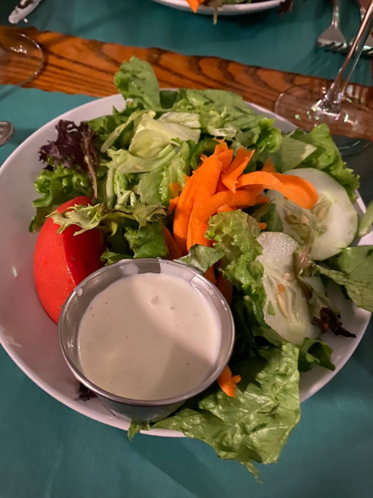 We were all served a very fresh house salad that came with the meal. I loved the Bleu Cheese dressing and Barb got the house creamy garlic on the side.