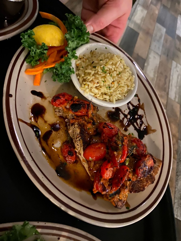 Dave ordered the night’s special, a Blackened Amberjack. He had it with Rice Pilaf as a side. The sauce, he said, was very tasty.