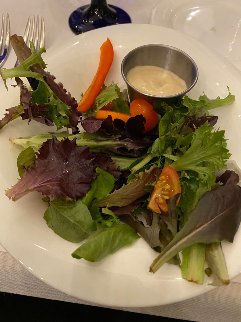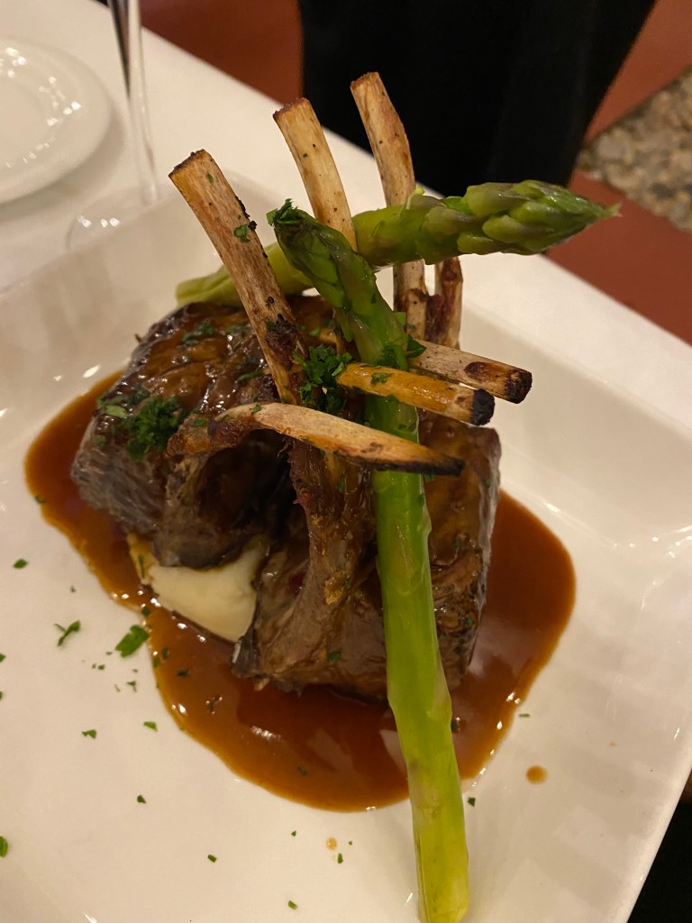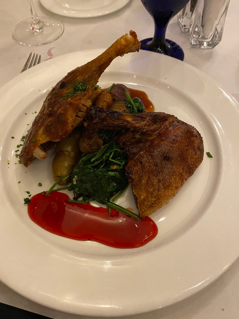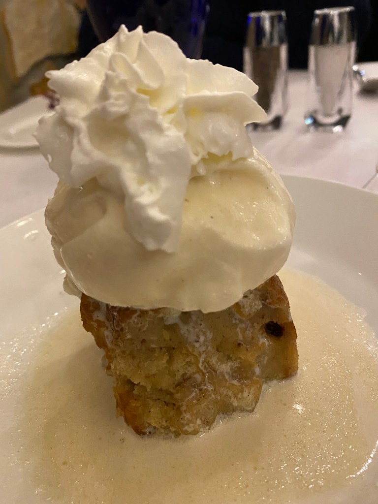 The homemade bread is fresh and presented warm. It has a great crust and soft inside. The dipping vinaigrette is a healthy alternative to butter.The Caesar salad is a minor upgrade to the standard house salad which comes with your entree.The standard house salad was a nice combination of fresh greens .The duck entree is basically the lower half of a duck. I love confit and thigh of duck, so I seem to order it almost every time I go to Verdi’s. It’s always crispy, served with a nice fruit sauce and spinach to keep me strong.Sol ordered the rack of lamb. It was served beautifully with big ass aparagus and a nice gravy. Sol felt it wasn’t quite medium rare, I loved it. I took home his leftovers and enjoyed them two days later.Carin had the grouper entree which she really liked. I’m no longer a fan ofGrouper, but the sweet potatoes and broccoli looked good.Barb had the Tripletail Mediterranean style, substituting veggies for whatever starch accompanied it. She was thrilled with her entree.A meal this good deserves a superior wine. I just happened to have this little beauty in my wine rack. It’s a perfect match for duck, lamb, steak, fish and any empty wine glass. If you can find it, buy it!Bread pudding with ice cream and whipped cream. Can you say ”Yowza”?Sol had a nice cup of coffee to end his meal. I have learned over rhe years that I’m a barbarian because I don’t have coffee at the end of my meals.