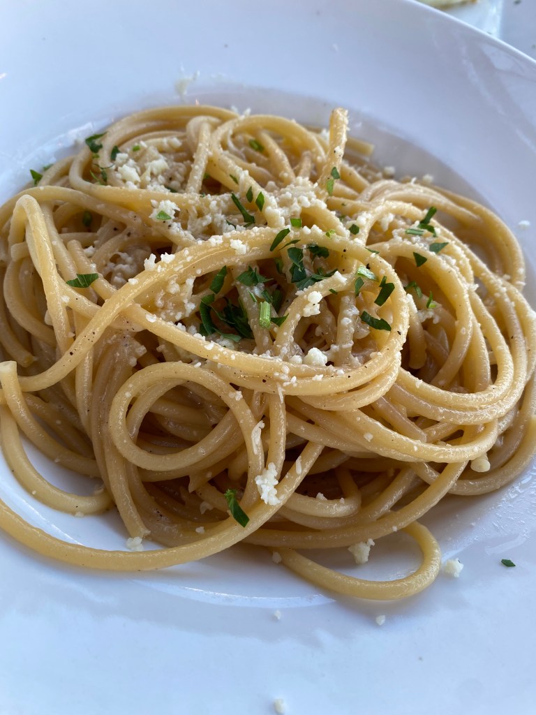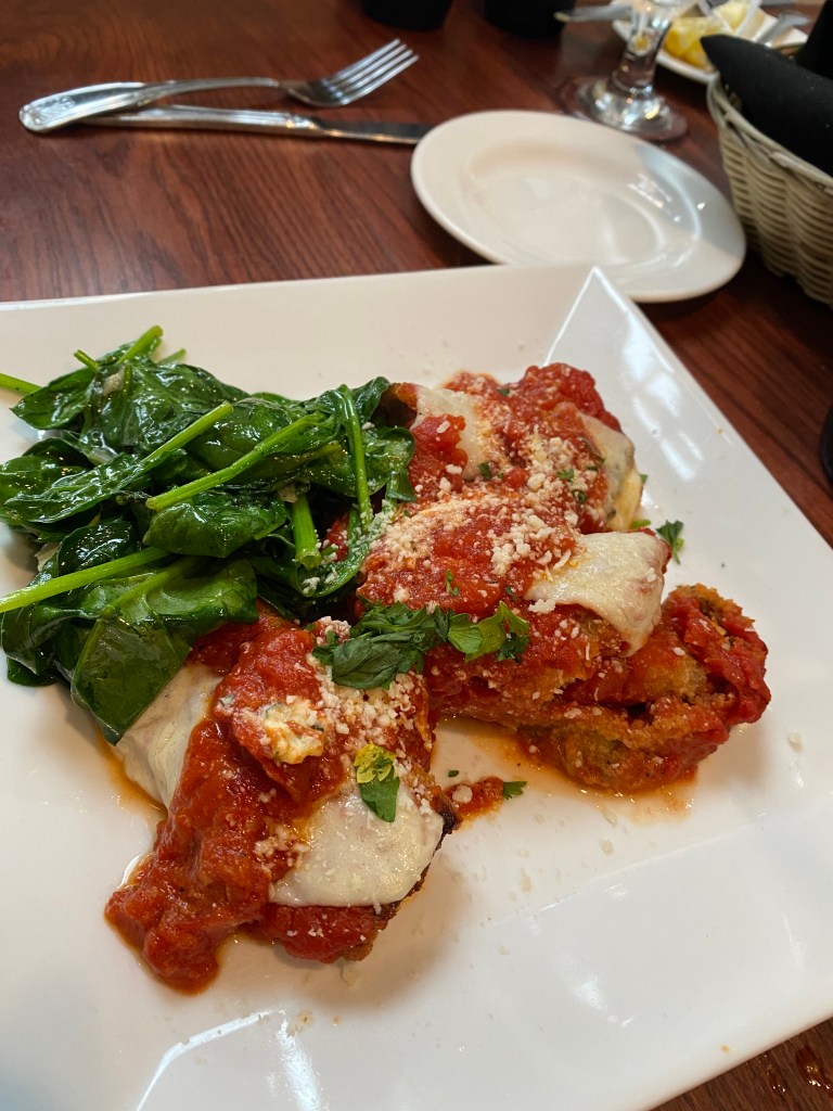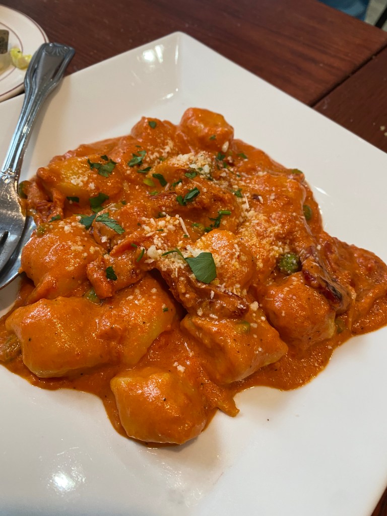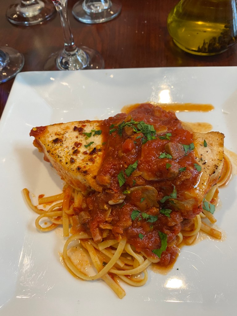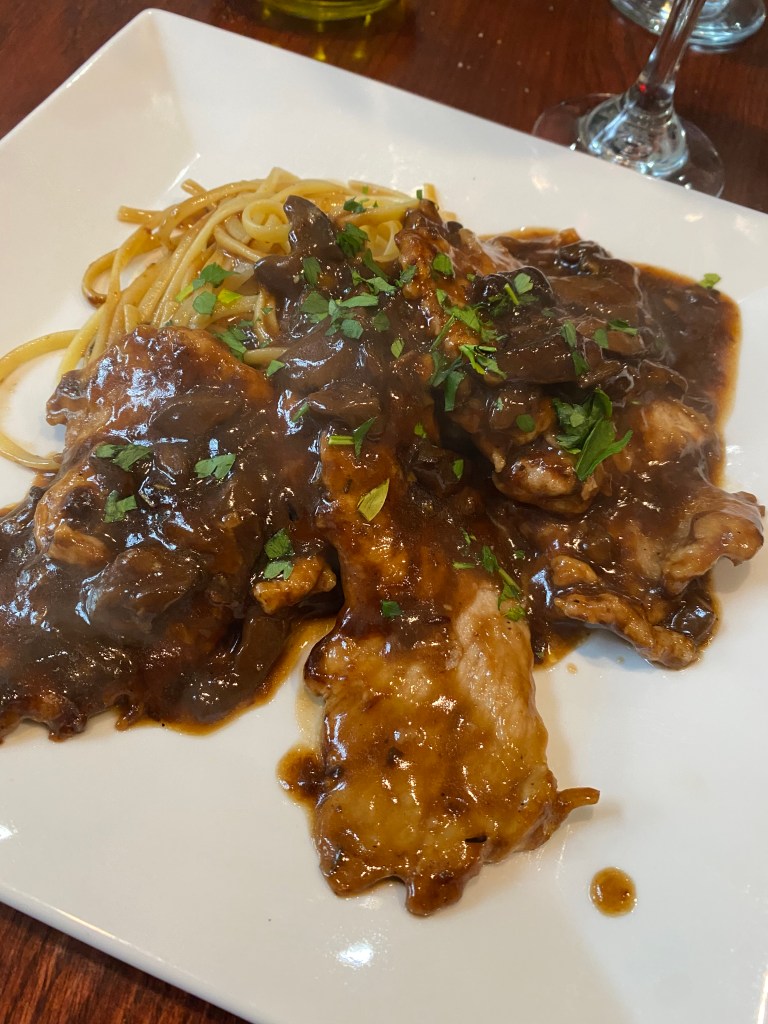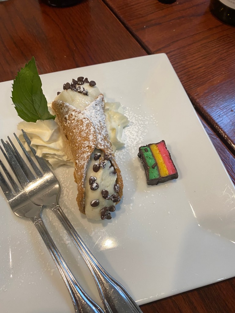 Our first visit was with Mike and Lynn. I didnt take pix of Mike’s salad or Lynn’s Calamari, so I planned on returning for pictures.The house madepotato gnocchi were light and delicious. The red sauce was not too dense, just right.Barb ordered the Eggplant Rollatini which was very lightly breaded. She got a little broccoli rabe instead if pasta.I had the veal and pasta in a wild mushroom sauce. The veal was very tender and the sauce was outasight!As we often do, we overordered so I had some yummy leftovers the next day.Lynn ordered the Swordfish special which was served over linguini. She said it was perfect.Mike went crazy exoticand ordered penne with meatballs, a meal of comfort food from his youth. He said it was as good as his mom’s.We shared a couple of desserts. This was the Hazelnut Chocolate mousse. Made in house. Wonderful!The cannoli had a crisp shell and nice, creamy ricotta filling with chocolate chips. What else could you ask for?The cup of decaff capucino came out hot and well-brewed. The bread at our second meal came out piping hot with a nice olive oil for dipping.They told me at our visit that they would make me Cacio e Pepewhen I returned. It’s a simple but wonderful Roman dish that I always crave.They presented it beautifully, but it was just slightly lacking in ”Pepe”. No problem, because there was a fresh pepper grinder right by my dish.Barb ordered the special Cod dishand switched out the pasta for some fresh spinach. She was very pleased.I asked our waiter to pick me out a good dessertHe chose the Panna Cotta which was the creamiest version of this dish that I’ve ever had.
