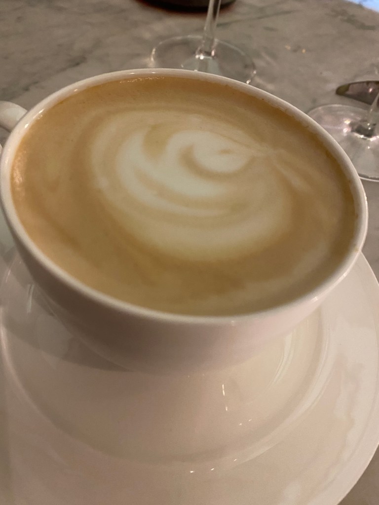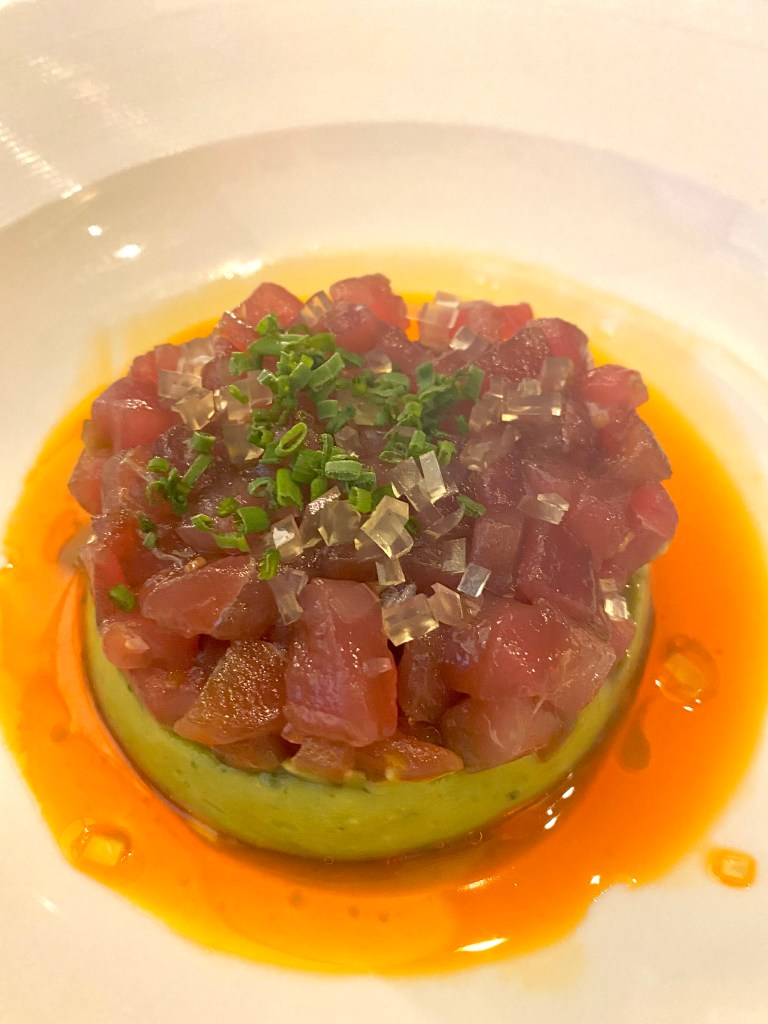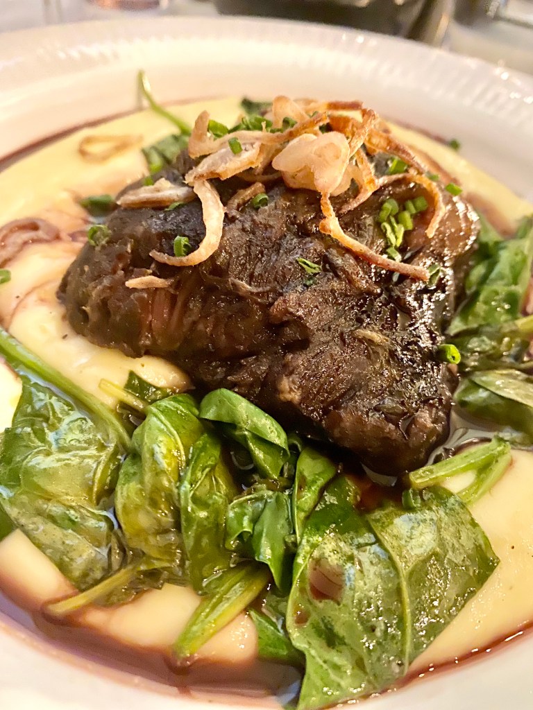 Lyn and Art getting ready to chow down.Lyn and I both started with the Beet Carpaccio. It was enhanced by goat cheese, shallots, orange marmalade and pumpkin seeds. We both really enjoyed this dish.Barb and Art both enjoyed their Mediterranean salad with romaine, kalamata olives, cherry tomatoes, onion, feta and a very nice balsamic vinaigrette.Art pulled this great old cab out of his hat. He obviously stores his wines properly, because the wine held up wonderfully for a bottle almost 20 years old. And boy did it taste great. I recently found a nice wine guy who introduced us to many good wineries and wines many years ago. He’s working part time in the local Bottle King. He recommended this Pinot Noir which we all enjoyed.Barb ordered the Tuna Tartar appetizer for her main course. It was beautifully presented and one of the most delicious versions of this dish that I’ve ever tasted.I ordered the Wagyu Beef Cheek for my entree. It reinforced my theory that the cheek is always the tastiest part of any animals. (Think fish cheeks, quanciale, and many other examples.) This dish was served with potato purée and sautéed spinach. It was a real winner.Lyn really enjoyed her pan-seared Red Snapper with its crispy skin, radish and asparagus. She gave me a taste which I also enjoyed.Art loved his Duck Breast with Baby Carrots, orange marmalade, cranberries, almond relish and pickled persimmons. That’s a mouthful of yum!I closed my meal with a decaf latte and Art had a double espresso.We all shared in a very delicious Crème Brûlée. The top was perfectly caramelized and wonderfully crunchy.Our very kind and thoughtful server, Naomi. She is living proof that an excellent server can really make your dining experience a pleasure.