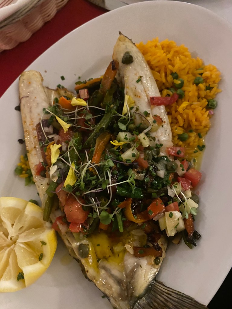 Carin had the Bronzino beautifully prepared and served with rice and some veggies. What? No potatoes au gratin? She was more than happy with her dish and side of rice.