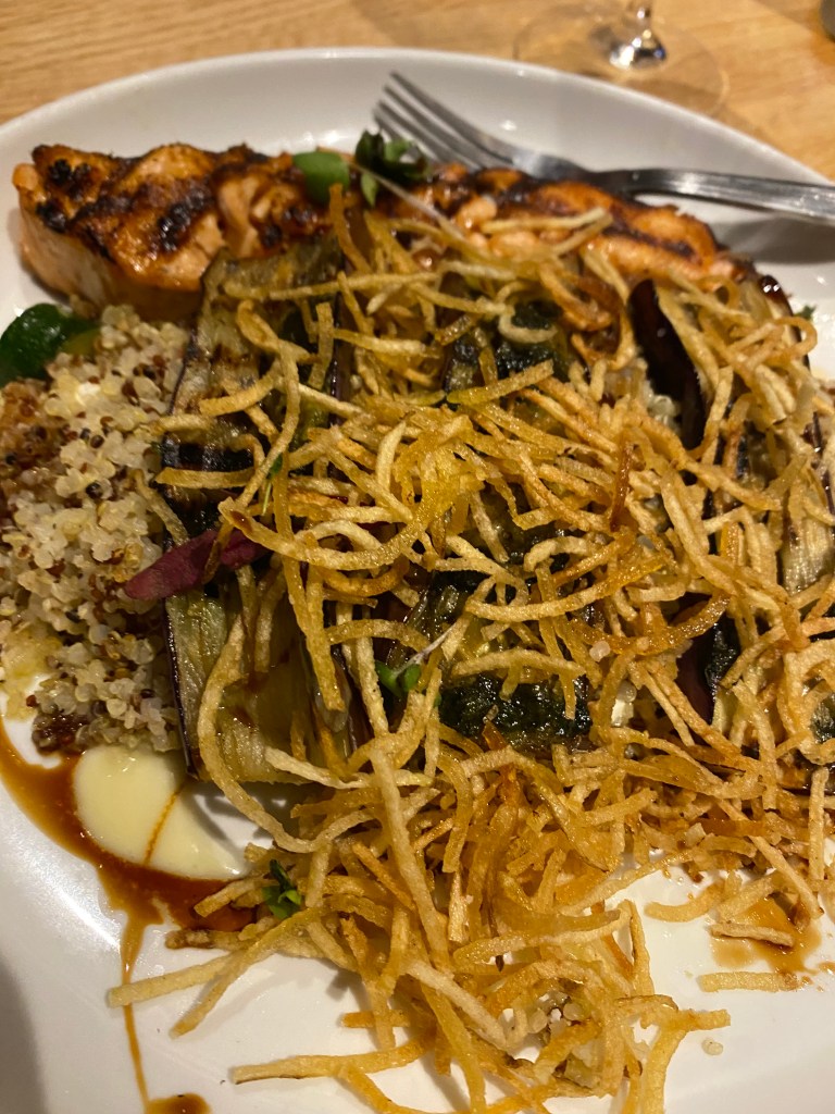 The meal started with an Amuse Boucheof a tomato-based soup with herbs and possibly puréed artichoke. A delicious tease.The ladies shared a plate of Coal Fired Spanish Octopus. Really tender and tasty.One of my very favorite things to eat which has become quite popular in the last 10 or fifteen years is Pork Belly. This Berkshire pork was crispy, not too fatty and exquisitely prepared. I want some now.A shock to my brain: Mike, the burger, pizza and scrapple connoisseur, ordered Baked Camembert garnished with olives and nut and a subtle sweet sauce. He further shocked me by claiming to like Brie as well. And here I thought he was a straight Velveeta kinda guy.I ordered a glass of Cab to go with my entree. They have different sized pours. This 9 ounce glass was $16 and well worth it because it was from a good bottle.My entree was a very rich and wonderful Ziti Carbonara. I always feel guilty eating Carbonara, but the pleasure I get from this dish outweighs the guilt.Mike (who always finds something) found Tagliatelle and added some Meatballs. I believe he enjoyed it more than his mom’s. I tasted and liked.Barb ordered the Herb Roasted Eggplant and added a nice piece of Salmon for a $12 supplement. She was very pleased with her dish.Lynn had a Chilean Seabass dish that tasted every bit as good as it looked.