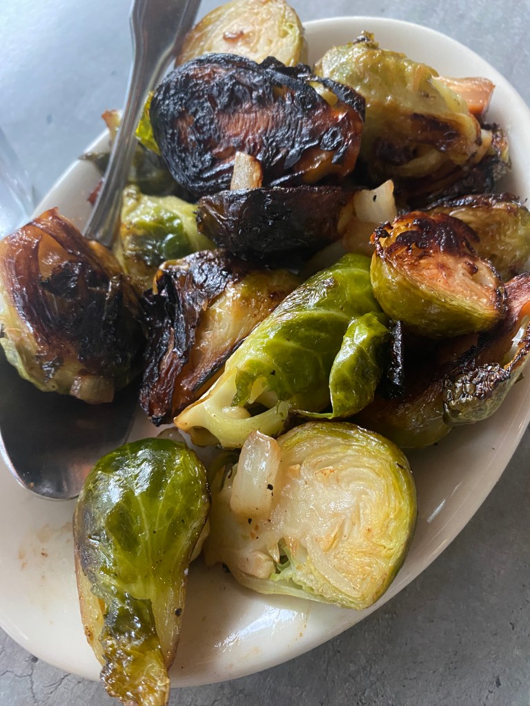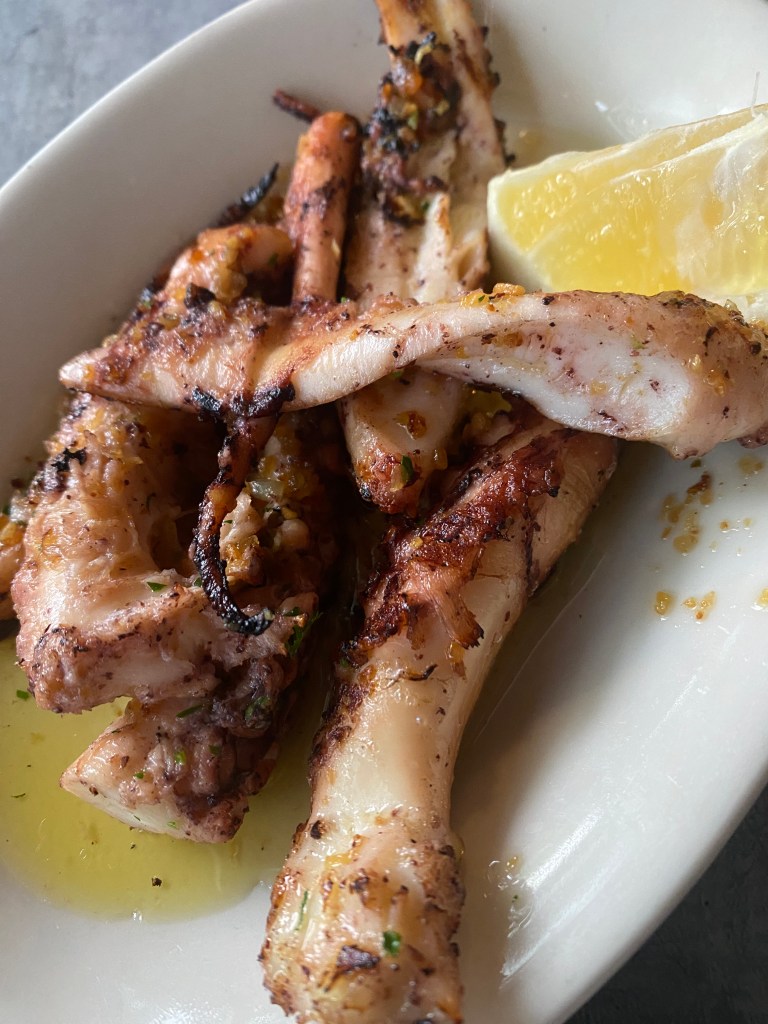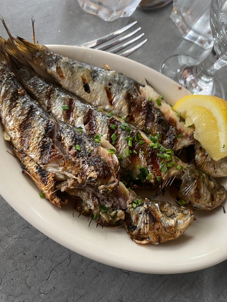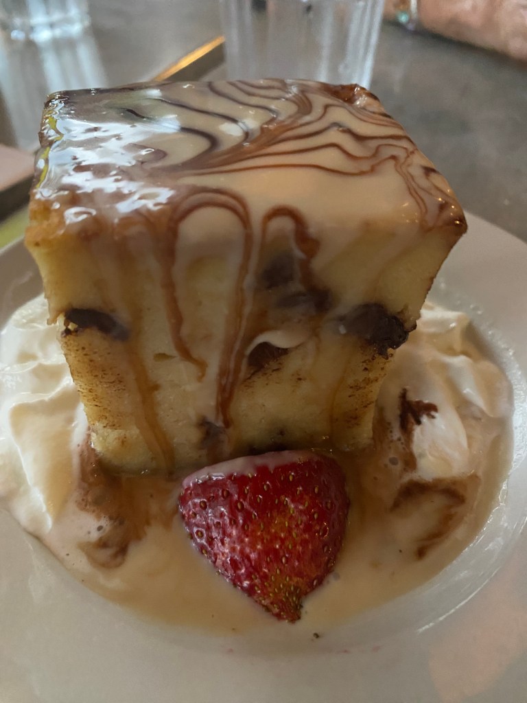 Since we love the food here and consider it upscale, we tend to go a little deeper into our wine collection. Good Pinot Noirs go with everything and Burgundy reds are wonderful matches for seafood and sushi. This puppy was a wonderful find at about $27.We had opened this Cote du Rhône (Viognier) the night before and I felt it would be a very nice pair for the fish and seafood at Blue Point. We shared our abundance of wine with the staff who truly appreciated it.I love fresh Sardines which are not commonly found in US restaurants. These came from Portugal and were perfectly grilled and served with some Portuguese olive oil.The mixed grill special that night was Artic Char and Alaskan Sablefish. Both were grilled perfectly, rarish per my request. I asked for a little salad as my side. This dish was a “home run!” I’m sure you’ve noticed that Barb frequently orders Grilled Octopus. This one is consistently among the best she gets.Being a healthy eater and, likewise, a cheap date, Barbs second dish was a side dish of Roasted Brussel Sprouts. These veggies were perfectly roasted and somewhat caramelized. $9 for her main dish. And they made her very happy and contented.My glazed Bread Pudding was dense and delicious. All of their desserts looked good. This one was made in house.Our server, Jessica, was a delightful young lady who knew the menu well, made good recommendations and was very friendly throughout the meal.