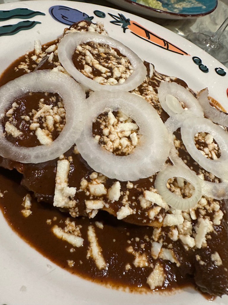 Being a cheesy guy, I can’t resist the lure of Queso Fondido. This one had Chorizo and Jalapeno mixed in. I must admit this photo was taken after I had eaten some of it. As I chowed this melty treat I sensed it coursing through my veins, going to my heart and calcifying. You know: a mixture of guilt and pleasure.A close-up of the guilty indulgence.As always, Barb went the healthier route and ordered a Ceviche. This one came with shrimp. She enjoyed it.I ordered an entree of Chicken Enchiladas in a Mole sauce. It came on a corn tortilla with sliced onions. This was a very tasty dish. The mole was excellent. It was also offered on a flour tortilla.They included a side of rice which was perfectly cooked and complemented my dish.