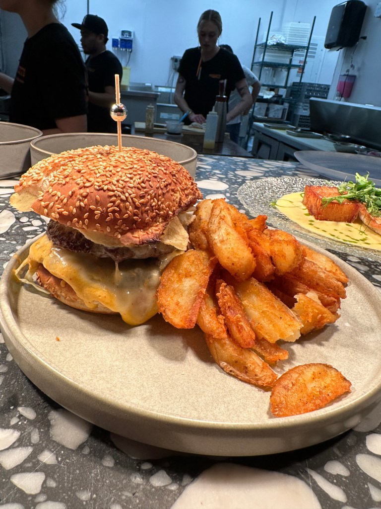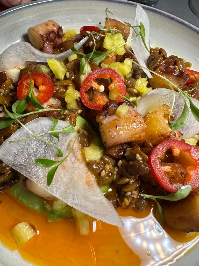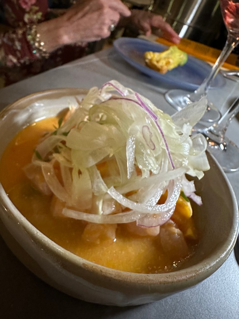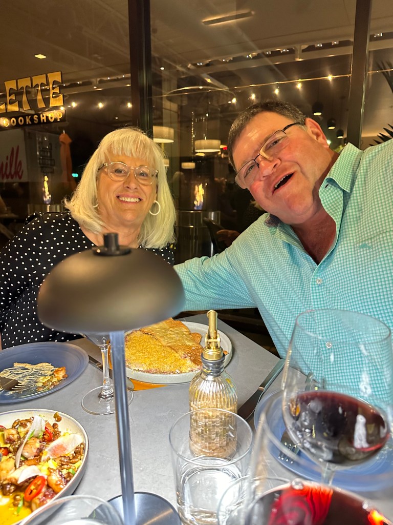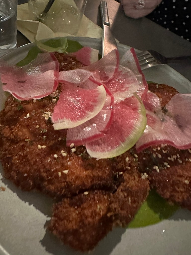 Doug and Debby enjoying the Al fresco scene.The menu for our meal.We had two orders of these Zucchini Blossoms filled with Njuda and cheese, coated and fried. Each order had two blossoms. I loved mine.This Roasted Octopus app was both gorgeous and delicious.It included some chiles, avocado and Oaxaca cheeses.The Snapper Ceviche was delish and garnished with a nice pile of sweet onion. Barb loved it.The six oysters on the half shell were delicious, but an indulgence at $19. They were cleanly shucked and served with some nice Mignonette.The Beef Tartare was a generous portion served with a horseradish aioli and sizable cracker.The Braised Leeks were a big hit topped with Raclette cheese and oreganato vinaigrette.These Veal Short ribs were wonderful. Doug shared them and gaveme one of the ribs. I’ll probably order them next time.Debby ordered the Chicken Shnitzel. This was the real deal. Nicely coated with a delicious crust, tender chicken inside, juicy and I believe those were sweet radish slices on top.I ordered a Smashburger which I thoroughly enjoyed. The fries were crispy crunchy, a perfect side. My pix didn’t come out well,so I took a picture of someone else’s before it was served.