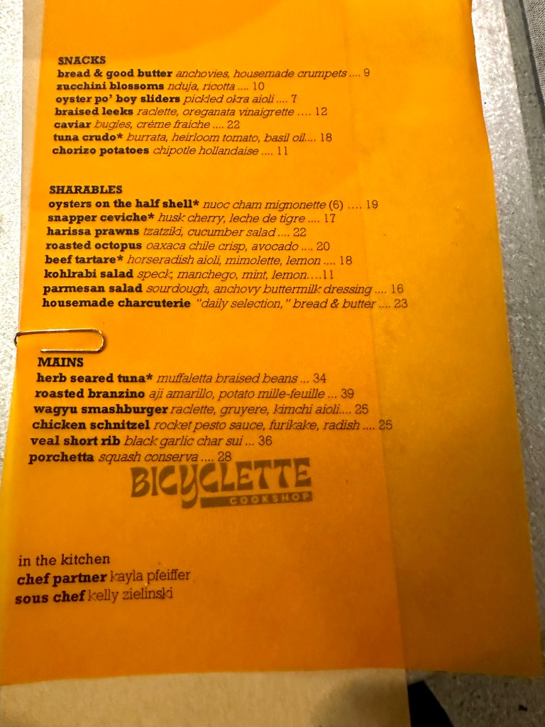 Bicyclette promises to be one of the future hot spots in Naples. The chef is truly talented. She has put in time at several great establishments and grew up in the business.She was trained at CIA, the school that has turned out so many great chefs, writers and entrepreneurs.I hope she hangs around Naples for many years to come. I’m looking forward to my next experience.