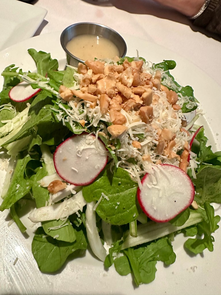 Barb switched from her normal choice of salad of Blue Bottle salad (which we often share) to the Arugula, shaved fennel, apples, Grana Padans, radish and cashew salad. She was thrilled with this salad.