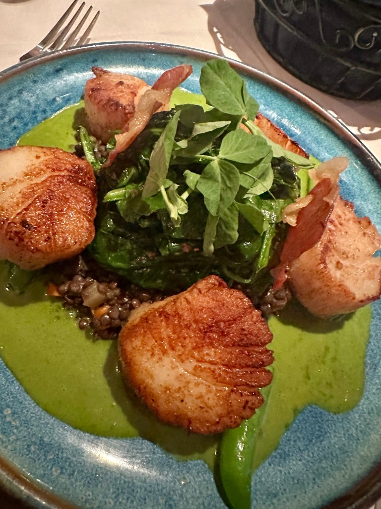 I strayed from my usual Duck entree choice and had Pan Seared Day boat Scallops with black lentils, crispy Prosciutto, braised vegetables, snap peas spinach and a tarragon and ramp emulsion. You can see it all in this picture. It was a surreal dish with enough for me to take home a scallop and veggies for lunch today. A second bit of wonderfulness.