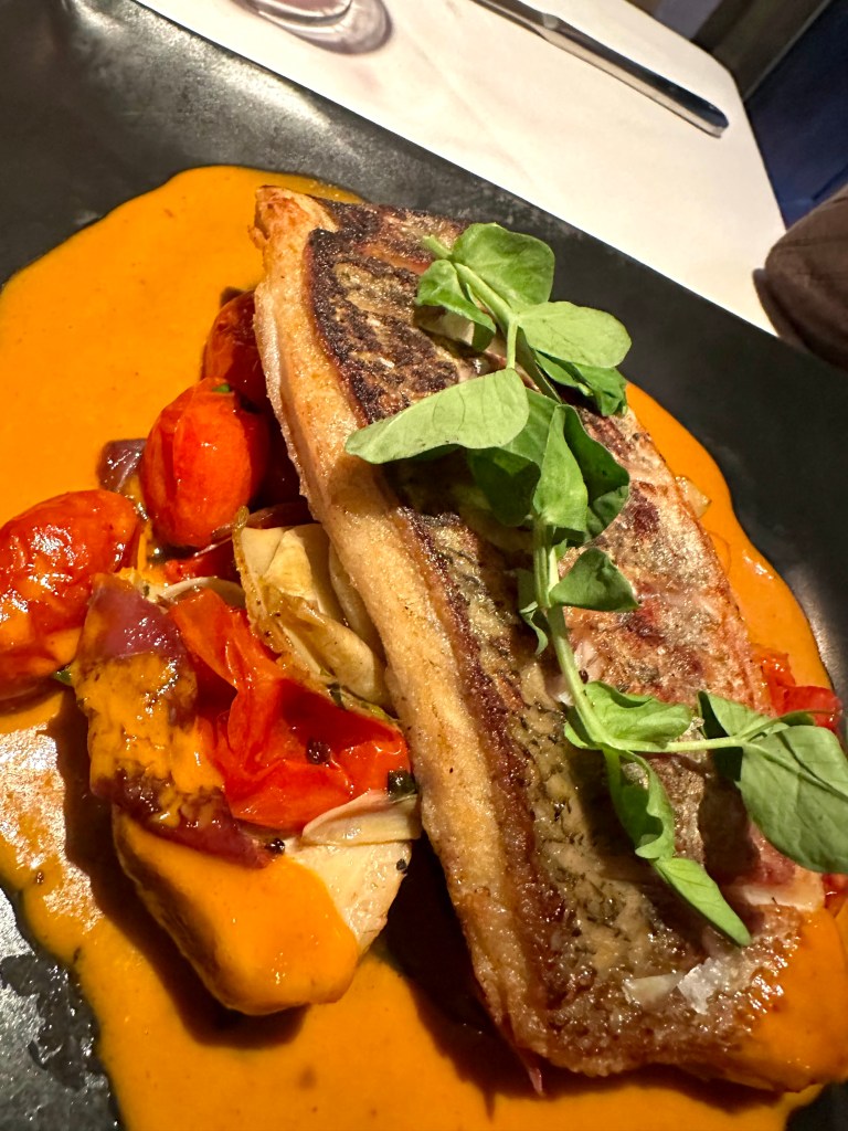 Barb loved her Pan Roasted Barramundi with artichoke hearts, Piquillo peppers, roasted red onions grape tomatoes and smoked paprika butter. I loved my taste.