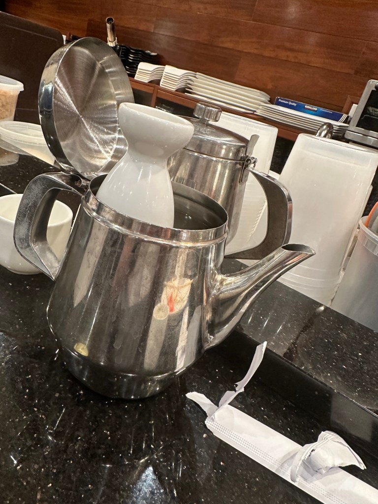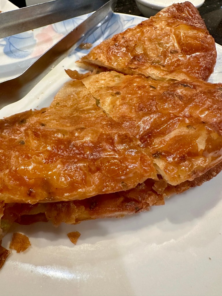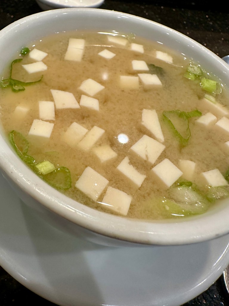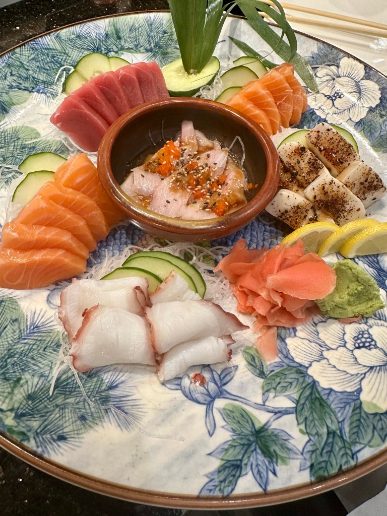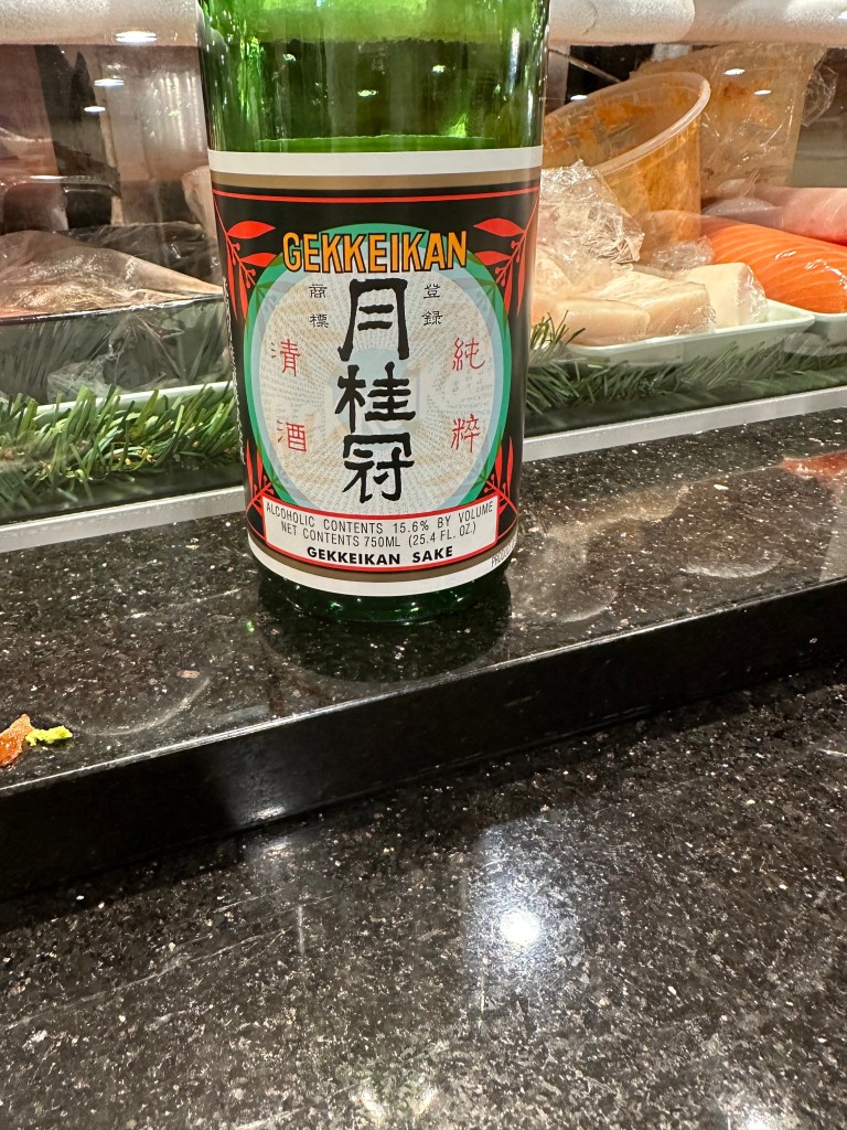 We started with some Edamame that the sushi chef laid on us. He seemed happy to have someone to chat with and serve.This very nice salad came with each entree. Very fresh and tasty. It had a good ginger dressing on the side.Another accompaniment was this Miso Soup. It tasted good, but was just a bit salty for my liking. I almost always order Scallion Pancake when it’s offered on any Asian menu. This one was deep fried, a bit oily, but incredibly crispy. I really enjoyed it.This Sashimi platter for two made the meal for both of us. There was a ton of fresh sashimi. The yellowtail was marinated in a special sauce that we both enjoyed. The white tuna was sprinkled with some interesting spices.This is a close-up of the platter. The fish choices were very basic, nothing exotic. Beautifully presented and fit the bill for what we desired that night.Barb had a yen for hotsake so we brought the fancy stuff, about $9 a bottle.They happily set up a fancy warmer to heat it up for us.This is Nick, our host, sushi chef and new favorite local guy.