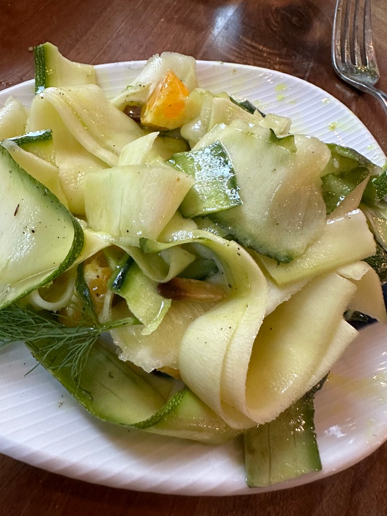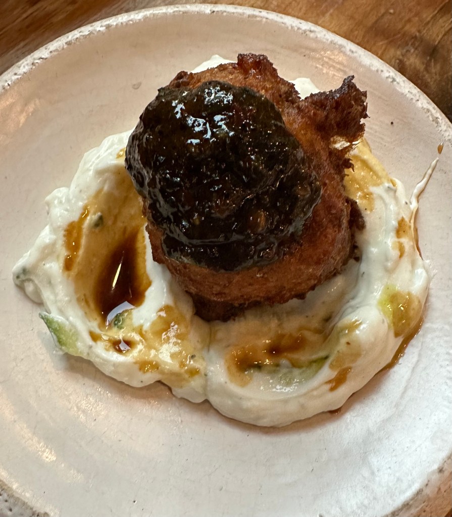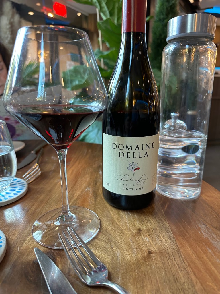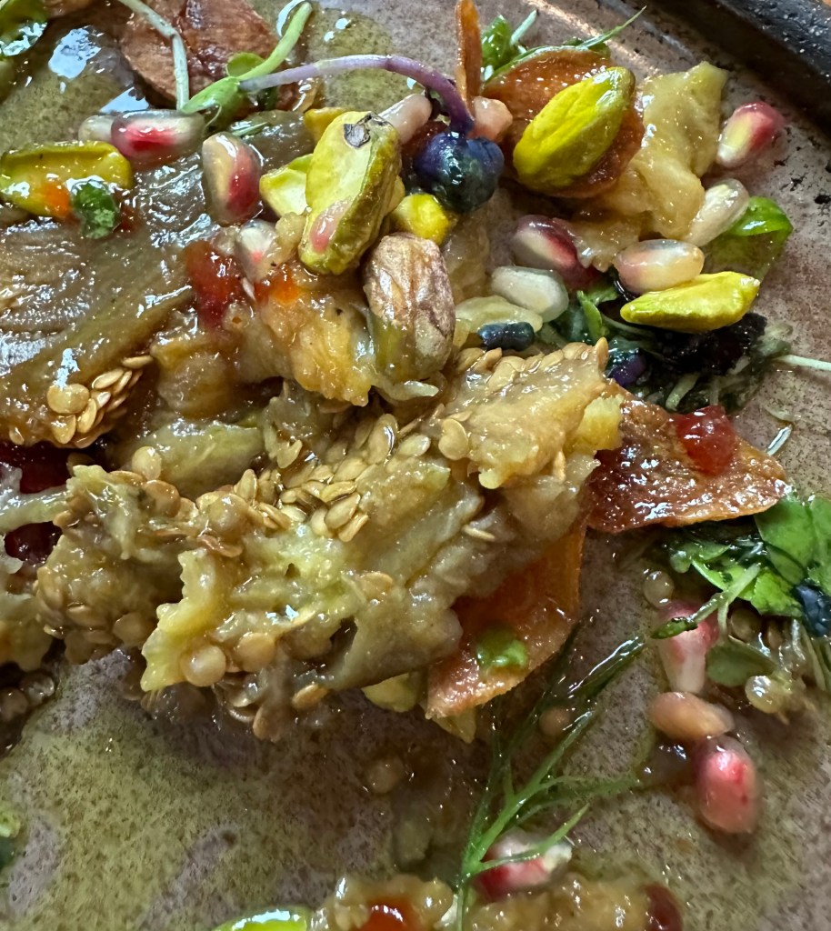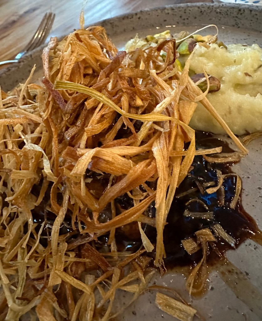 I had just received a couple of cases of wines I looked forward to enjoying. This Pinot Noir was a great find at less than half the retail price from Wineslash.com. I had enjoyed some a couple months ago. I’m thrilled that I was able to reorder 6 bottles. It was an absolutely perfectmatch for this meal.We started with this big puffy bread that came with two tasty dips: a tomato paste in olive oil and balsamic and something like hummus with olive oil. Of course, I started eating it before I remembered to snap my picture.Good job editing.We also started devouring this Smoked Roasted Eggplant immediately. It was gorgeous as well as delicious. They have a much better picture of this on their website. If you love eggplant, make sure you come and eat this dish. Barb ordered this appetizer called Zucchini Beauty. It was enormous and layered with tasty flavors like orange, fennel, dill and an excellent dressing applied with a deft hand.After knocking off the top of the Zucchini Beauty, we found a plethora of shaved zucchini. At the base of this dish, Barb saw a stop sign and said: “no mas. I surrender.” She had thoroughly enjoyed her meal and patiently watched me march on.Our server,Muratt, insisted that I try their Mucver which I told him is one of my favorite Middle Eastern dishes. It is a zucchini pancake. This one was garnished with tzatziki , evoo and pamagranite molasses. It was unique in form and presentation. I loved it.Competing with my options of Oxtail or Lambshank, was this wonderful Smoked Shirt Rib with Whipped Potatoes and a pile of, I believe, fried onions.