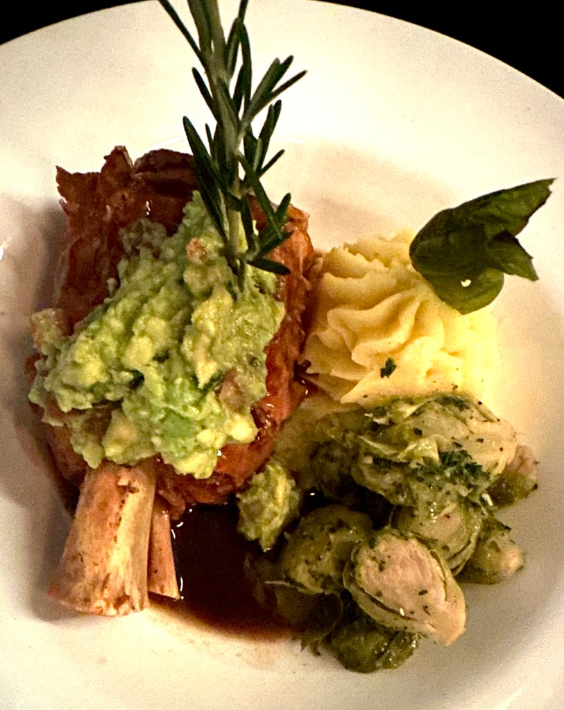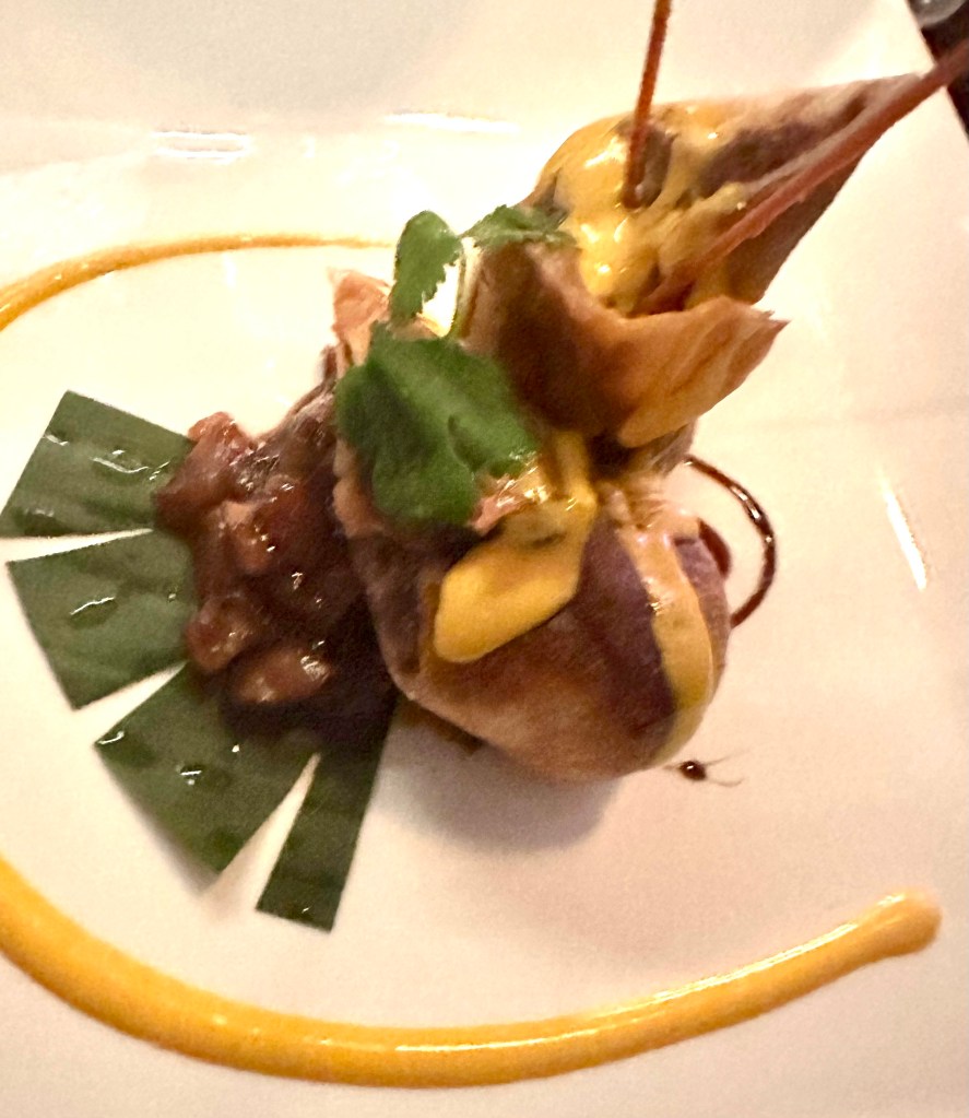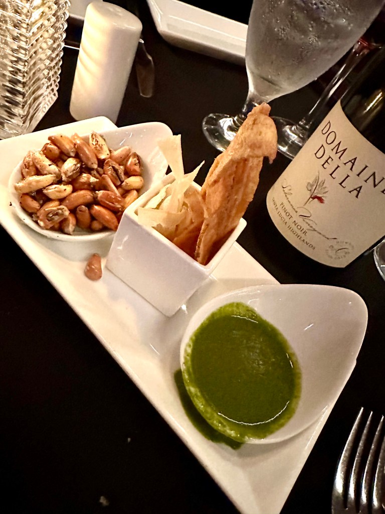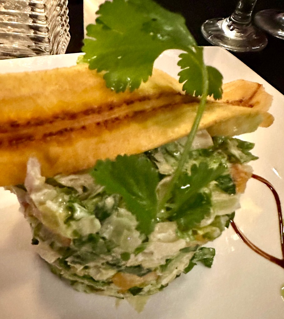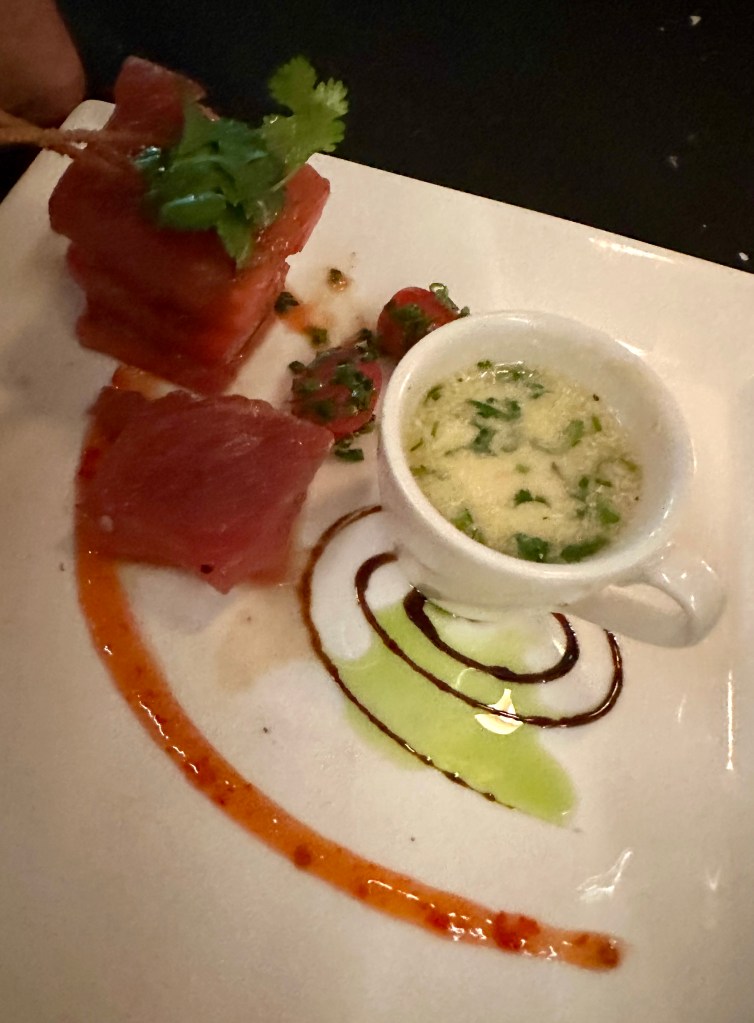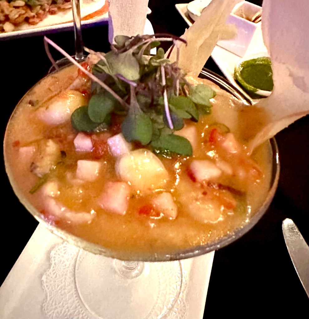 Bobby and Debbie prepare for a culinary adventure.We were started out with typical Corn kernels which get dipped in cilantro sauce. I believe the tall items were fried or baked plantain chips.This was a fun amuse Bouche.We’ve been bringing this wonderful Pinot Noir to lots of restaurants this year. They had a $30 corkage fee which is alittle high, but fair when you bring a bottle of greater value.The Caesar Salad at Selva is quite unique. They chop up all the ingredients, mix them with their dressing, shape them in a tube and garnish it with cilantro and plantain chips. We all shared this salad and enjoyed it immensely. It was a very impressive presentation.Parihuella is a Peruvian style bouillabaisse.I order it whenever I see it on a menu. This one was partially puréed and filled with plenty of seafood. It was easily the best Paihella I have ever had (and I’ve had a lot.) Bobby and I both ordered it and were thrilled with our soup. The Selva Wild Ceviche was the lone dish that was somewhat underwhelming. (I may have switched this photo with the Wahoo ceviche. Probably should not admit that fact, but it’s now three days and a lot of wine later.)The dish was okay, but paled in comparison to everything else we ate.Barb ordered this Triologia: a sampler of Wild, Spicy Tuna and Maya Shrimp ceviche. It was served on wonton crisps. Her verdict: yummy!This was the Wahoo ceviche. My taste was small, but impressive. Lots of quick hands at this table.I ordered this Oyster Ceviche which may have been a special that night. It was indeed quite special. The oysters were freshly shucked and served in a limey, creamy cilantro sauce. The sweet potato was one of the 2,000 varieties of potato grown in Peru.Bobby had a yen for pork, so in an act of pure gluttony (and after fifty years of friendship, I would expect no less of him), he ordered the only entree. This dish tasted good and was beautifully put together. It proved, however, to be his dining Waterloo. So he packed it up and took it home to attack another day.Barb ordered this Tuna Tiradito. The fresh sushi grade Tuna was marinated with ginger, sesame and soy sauce assembled with cubes of fresh watermelon. Another delicious and beautiful presentation.The Short Rib Spring Roll was composed of beef short rib, red onion, manchego and mozzarella cheeses, with some balsamic pear chutney and yellow pepper aioli. I remember commenting on how lovely it looked, but then it must have flown off of the plate before I got a taste. I was informed that it was quite delicious. You snooze…you lose.I ordered two appetizers that came together. The Selva’s Crabcake was nicely made and better than most. The Jumbo Sea Scallops were encrusted with Macadamia nut pesto and finished with honey and orange infused sweet potato puree. They were absolutely delicious.