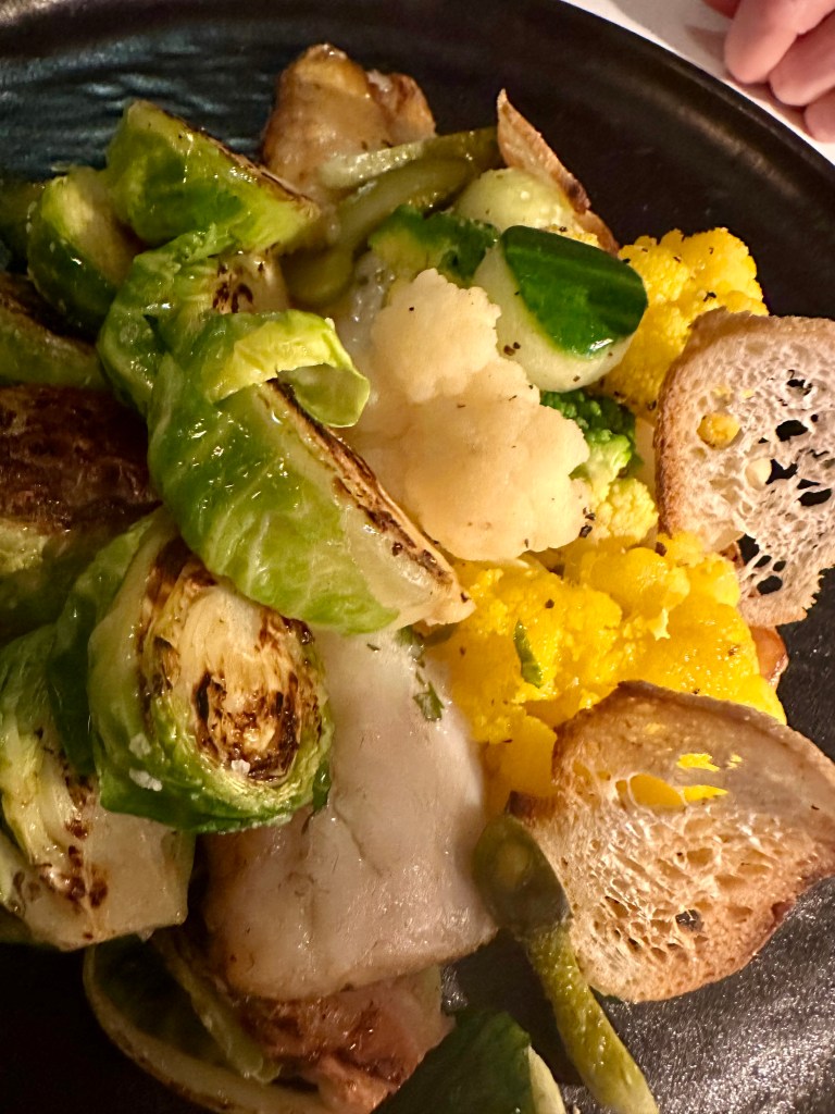 Barb ordered Branzino filet and switched out the potatoes for Brussel sprouts. A nicely presented plate with perfectly cooked sprouts. She was very happy with her dish.