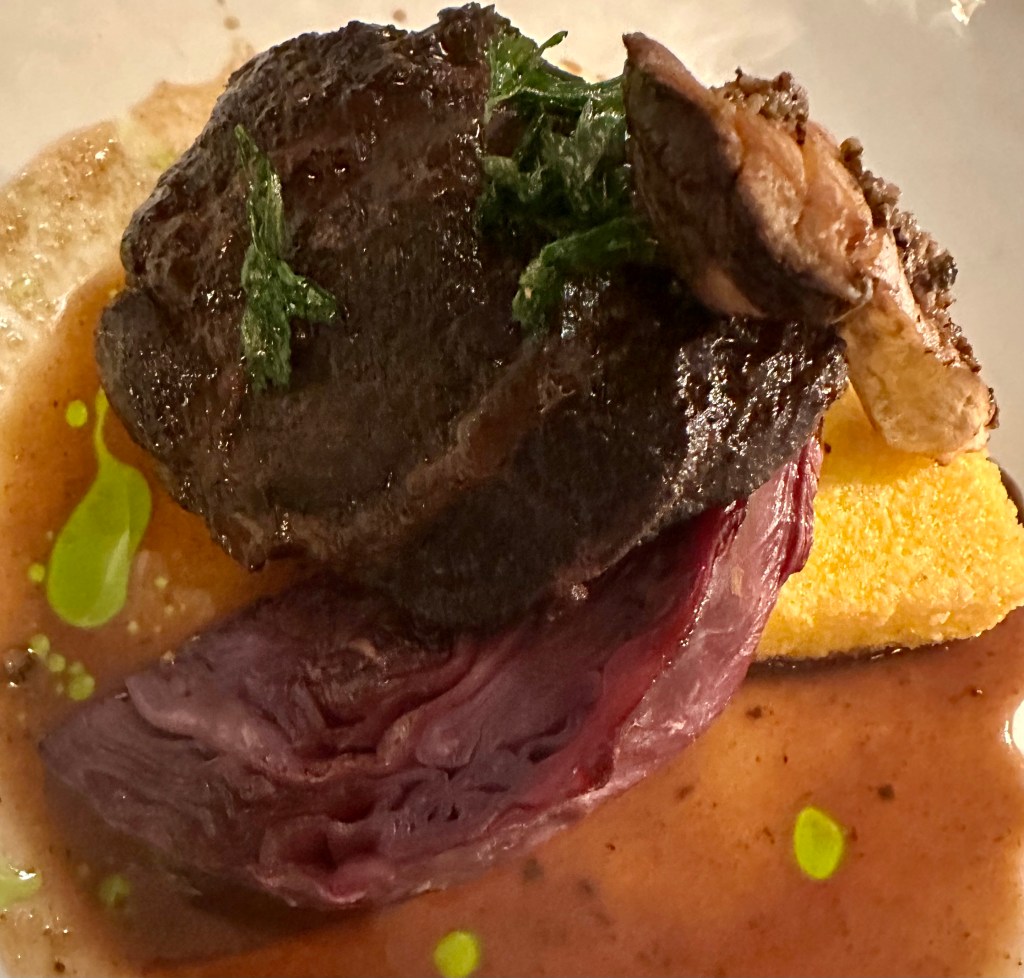 A second special that wowed me was Beef Cheek, another dish that’s hard to find. This one was wrapped in red cabbage with a large slice of Chanterelle mushroom. It was accompanied by a crispy Polenta. Wowza! What a dish.
