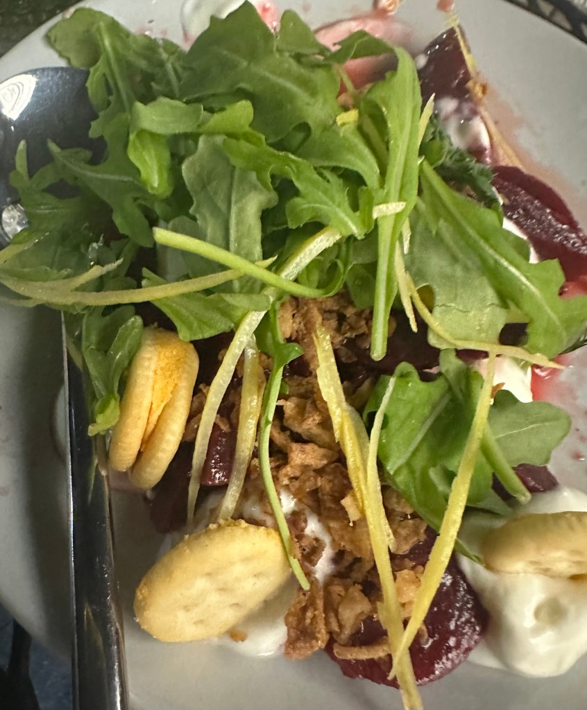 When we dine out with Jay, we bring the good stuff, knowing that he will reciprocate.And this evening he certainly did!When we arrived we were greeted by Achmed, the evening manager and very gracious host.The pita bread here was thicker than most, a perfect dipper for the many tasty appetizers.We started our meal with Carrot Tarator. A carrot ribbon sauté with walnuts, dill and yogurt. Quite delicious. Slow roasted baby Beetroot with ritz crackers, green onions and Arugula.Very nice.This is the Gem Lettuce Greek Salad that was covered with a large slice of feta cheese. It was very good and perfect for sharing.This dish of roots featured celery, carrots and grated cheese. Very unusual and quite enjoyable.This dish featured Shishito peppers. Some were quite hot, a normal quality of shishitos. We enjoyed it.This plate of Monti was elevated by its Yogurt dressing. Monti is very common in the Russian restaurants we frequent in and around Philly. We also get it at a Turkish restaurant, Aspendos, in Princeton.These Monti were smaller than we are used to, but remain meat filled dumplings. One of my favorite dishes.The Shrimp Casserole was very nice. I enjoyed the tomato sauce which had a subtle spicy bite. The shrimp were just slightly overcooked, which occurs commonly in seafood stews and Paella.The Leeks and Calamari dish was served in a nice sauce and covered with fried shredded leeks. It was a nice presentation of a vegetable served two ways.