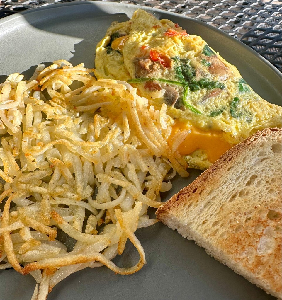 Jay and I returned twice for breakfasts.We agreed that the service and quality of food were excellent. Both times we split a veggie omelette. We had pancakes once and found them a little heavy for our liking. We shared veggie crepes the second time and found them much more to our liking. We also shared Eggs Benedict and requested lightly cooked eggs. They came out a little more done than we wanted. Our waiter went inside and had the cooks make new eggs which came out perfectly.